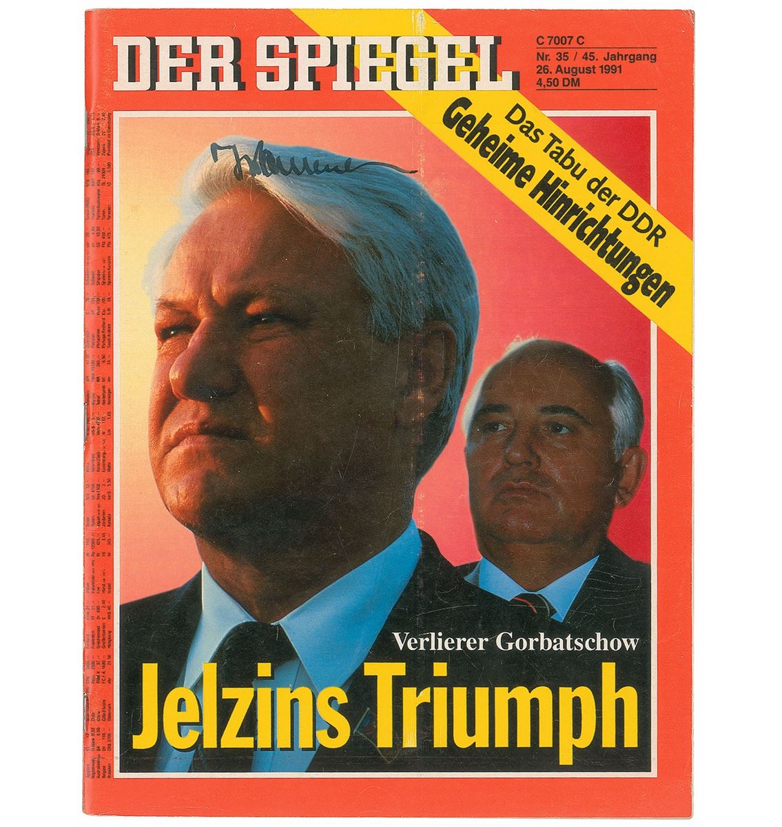 German Der Spiegel magazine from August 26, 1991, 8.25 x 11, 234 pages, featuring images of Yeltsin and Mikhail Gorbachev on the front cover, with the title reading (translated), “Loser Gorbachev, Yeltsin’s Triumph,” signed in black ink by Yeltsin. Some printing flaws to front cover, otherwise fine condition.