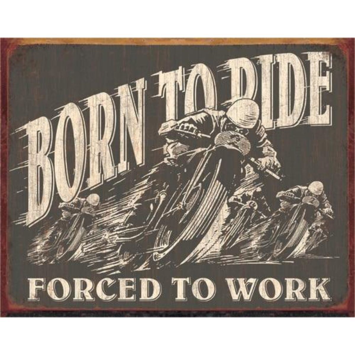 "Born To Ride, Forced To Work" garage, pub bar metal sign. 12 1/2" X 16" with pre-drilled holes for mounting.Â