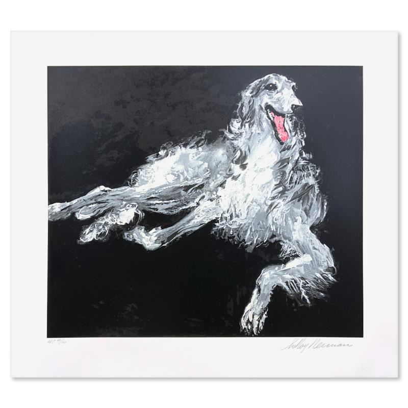 "Borzoi" is a limited edition serigraph on paper by LeRoy Neiman (1921-2012), HC numbered 82/100 and hand signed by the artist. Includes Letter of Authenticity. Measures approx. 36.5" x 33" (border), 28" x 24" (image). Due to the age of the piece there is very minor creasing in the white border area that will be concealed when framed.