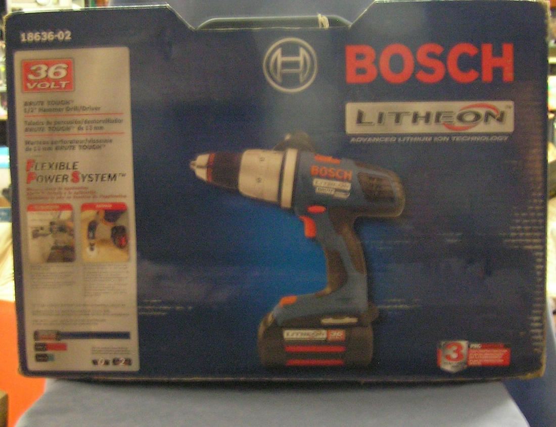 Bosch litheon 36 volt ½?? hammer drill/driver kit this brute tough five piece kit comes with drill, dual battery packs, heavy duty charger and grip handle mint never used in original box est. value $950.00-$1000.00