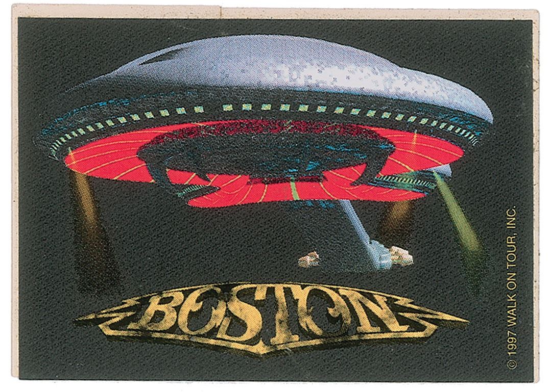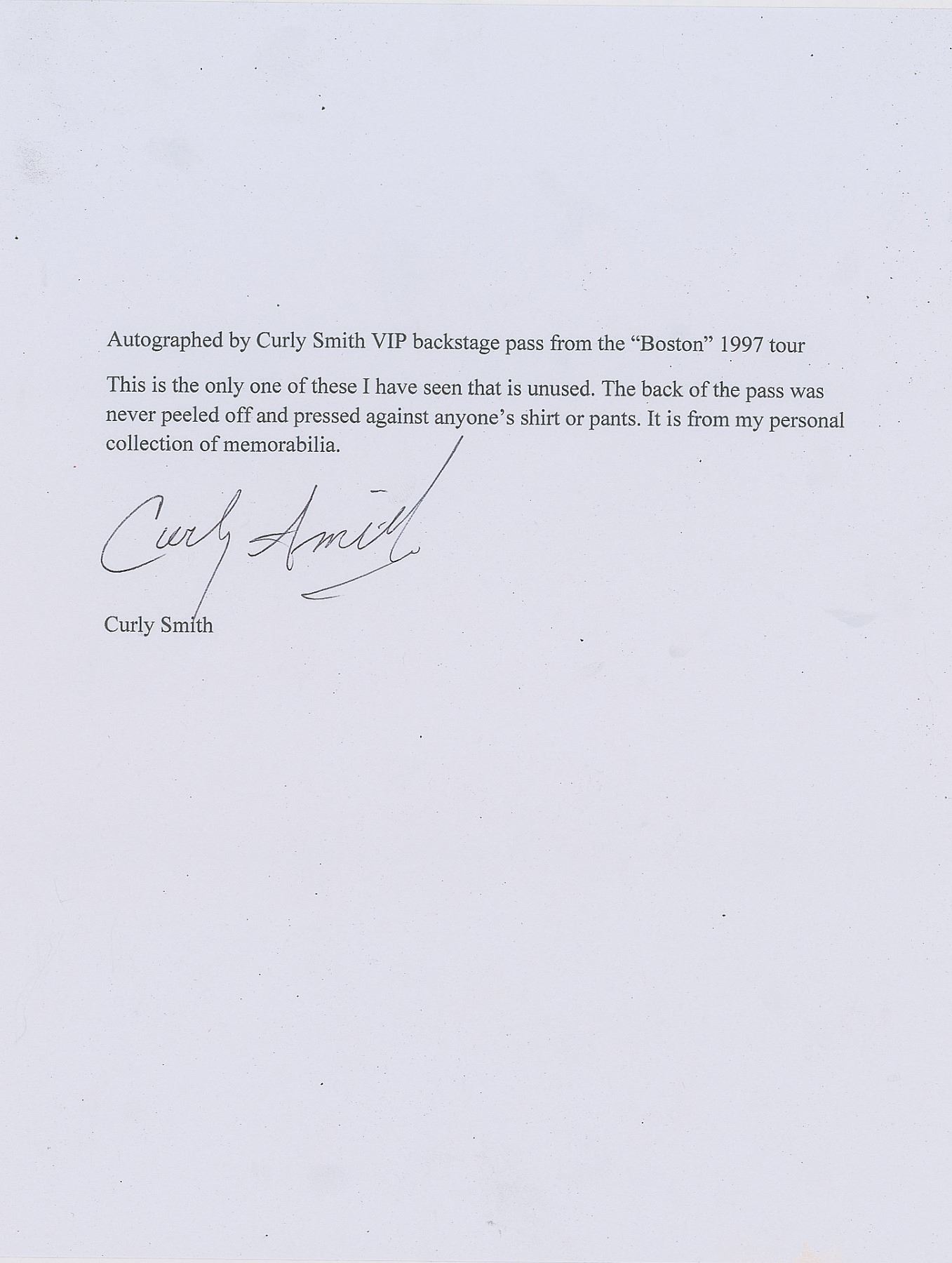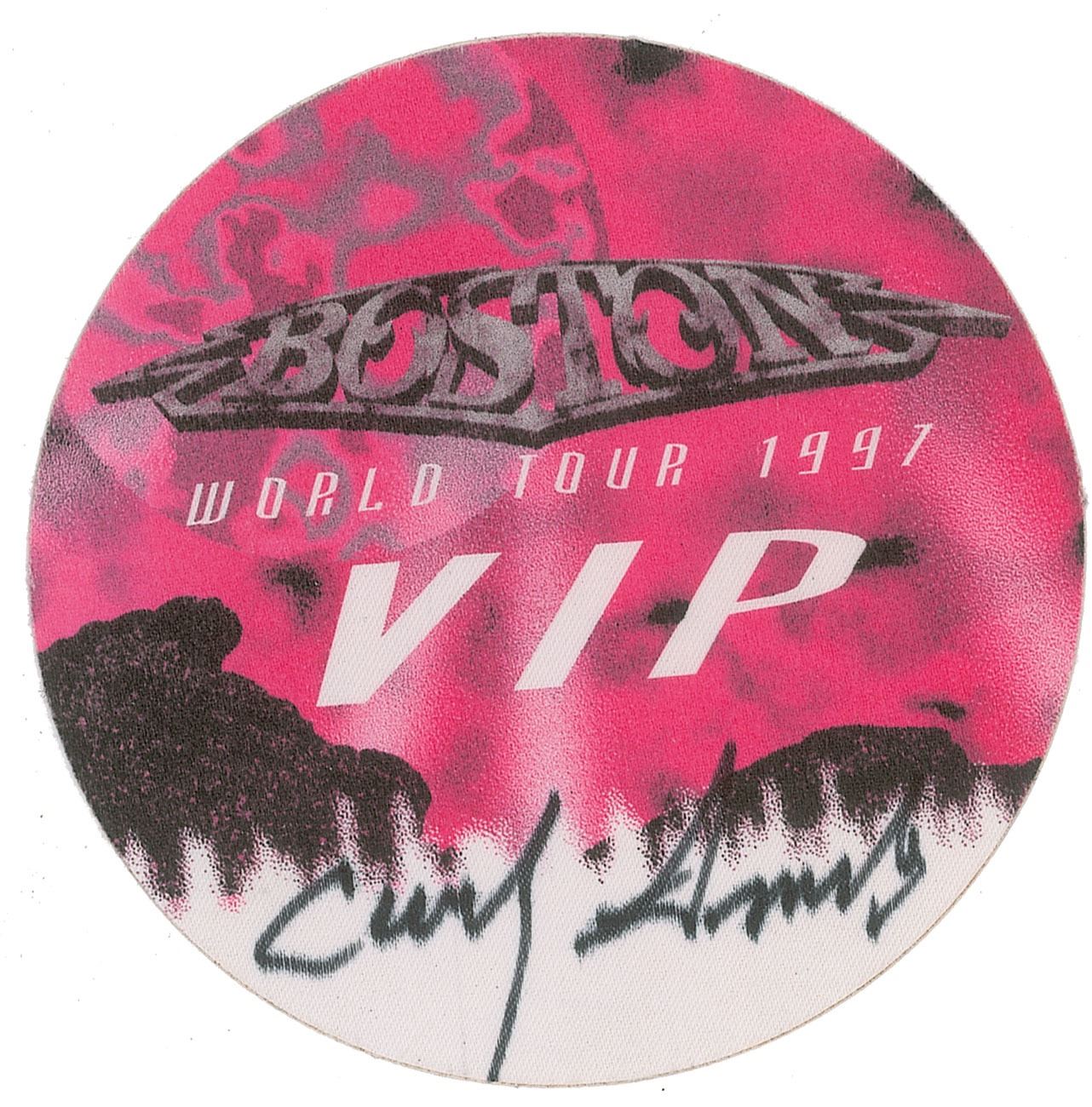 Unused backstage VIP cloth pass from Boston's 1997 World Tour, 3.75? in diameter, signed in black felt tip by Boston drummer Curly Smith. The pass retains its original backing. Also includes an unused decal for Boston's 1997 Walk On Tour. In very fine condition. From the personal collection of Curly Smith and accompanied by a signed letter of authenticity for the backstage pass, in part: "This is the only one of these that I have seen that is unused. The back of the pass was never peeled off and pressed against anyone's shirt or pants." Formerly a member of the band Jo Jo Gunne and a well-respected session drummer, Smith became Boston's drummer in October 1994. In addition to his drumming duties, Smith played blues harp and provided backing vocals for Boston.