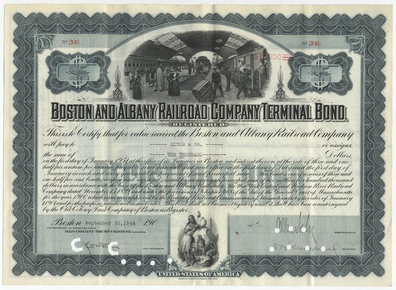 1944, Massachusetts. $10,000 bond bearing 3 1/2% interest. Blue/Black. Attractive engraved vignette at top center of an interior view of a busy railroad station. Lightly punch cancelled.
