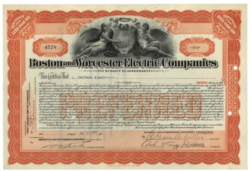 1923, Massachusetts. Stock certificate for 10 share. Orange/Black. Engraved vignette of seated allegorical figures flanking U.S. shield at top center. Uncancelled and fine.