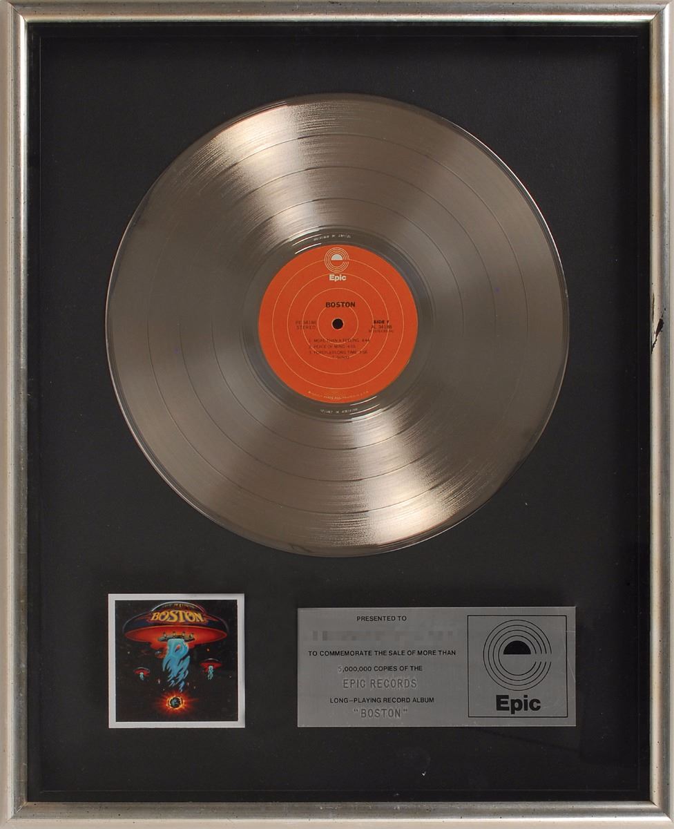 In-house floater-style multi-platinum sales award presented “to commemorate the sale of more than 5,000,000 copies of the Epic Records long-playing record album ‘Boston.’” Framed with its disc, plate, and a small image of the album cover to an overall size of 17.25 x 21.25. Award retains its original backing with a New York Frame and Picture label. In fine condition.