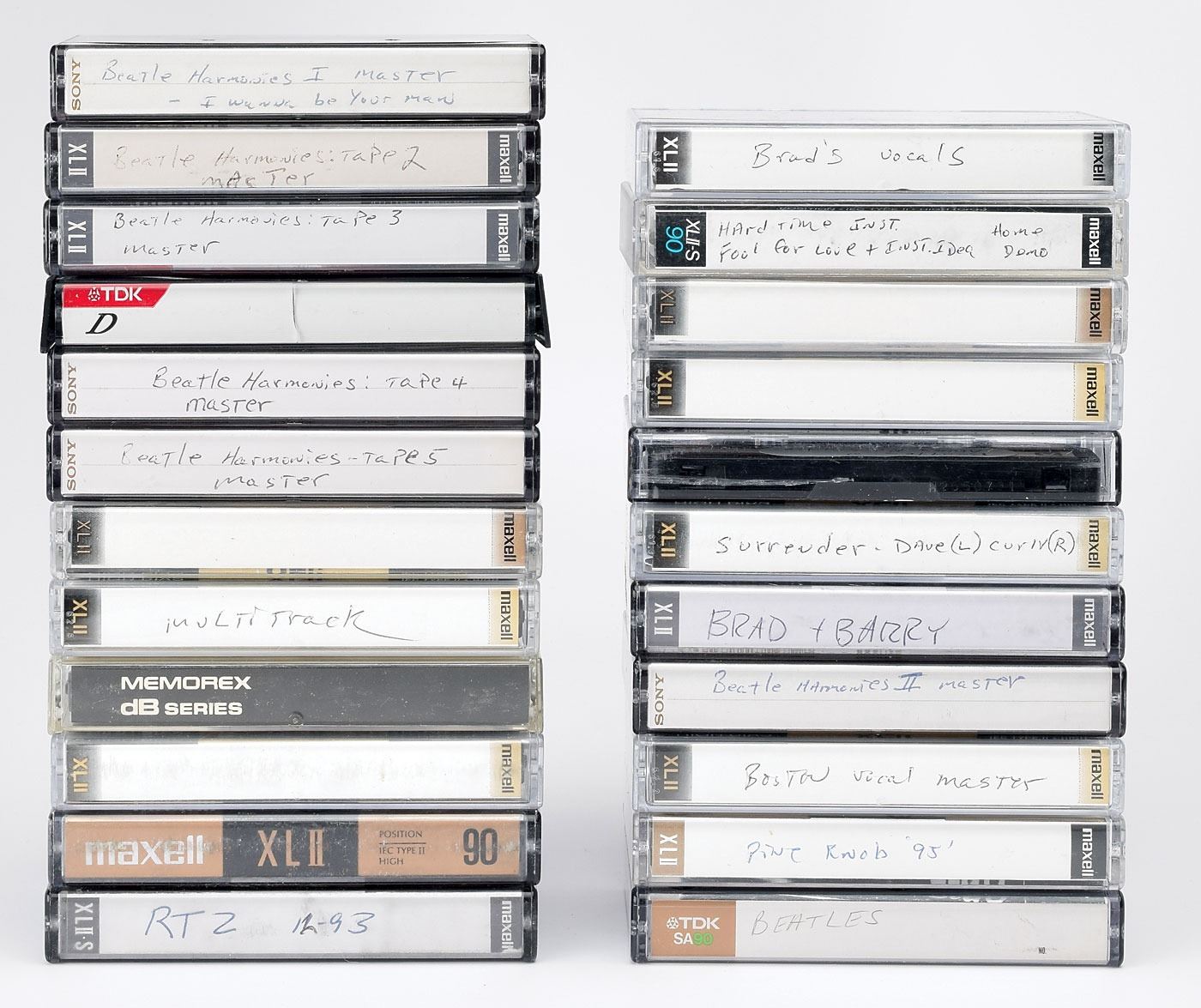 Brad Delp's collection of 21 audio cassette tapes, most marked in Delp's own hand on the spine or label, featuring songs from Boston, RTZ, solo work, and the Beatles. Title annotations and contents include: Pine Knob '95; Boston Vocal Master; RTZ 12-93; Dave's Tracks; Brad & Barry; Barry Multitrack; Monks Multitrack; I Need Your Love (Delp & Goudreau alternate take); Surrender to Me (Dave & Curly harmonies); Hard Time and Fool For Love Home Demo; Brad's vocals (Boston songs); multitrack Boston tour harmonies; Barry's Tunes (with instrumentals and early takes of Delp & Goudreau tracks); six tapes marked as Beatles harmony masters; and Beatles @ Abbey Rd Studio. Also includes two additional empty cases marked as Beatles. The most interesting tape may be one marked "Boston (Live 1978) (1987)," which is defective and slow, needing pitch correction, but featuring the songs 'Amanda,' 'Long Time,' 'Don't Look Back,' an interview with Brad Delp, and the album versions of 'Cool the Engines,' 'I Think I Like It,' 'Peace of Mind,' and others. In overall fine condition. Accompanied by a cardboard box with a shipping label addressed to Brad Delp at his New Hampshire home. Brad would record his own harmonies of Boston songs to teach each new member: he would record each individual harmony part using portions that he sang, and then would give a cassette tape to the new member so they knew what to sing.