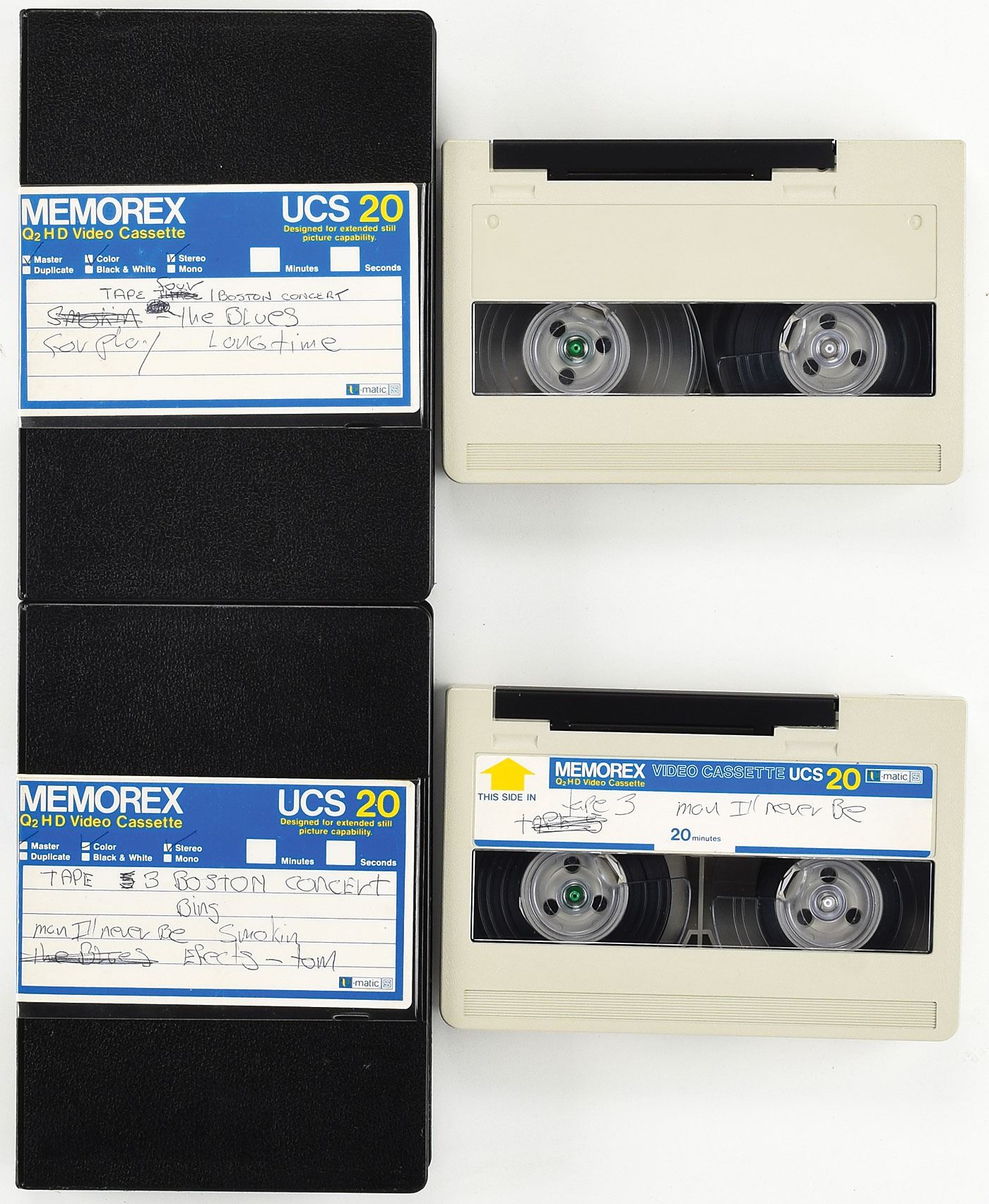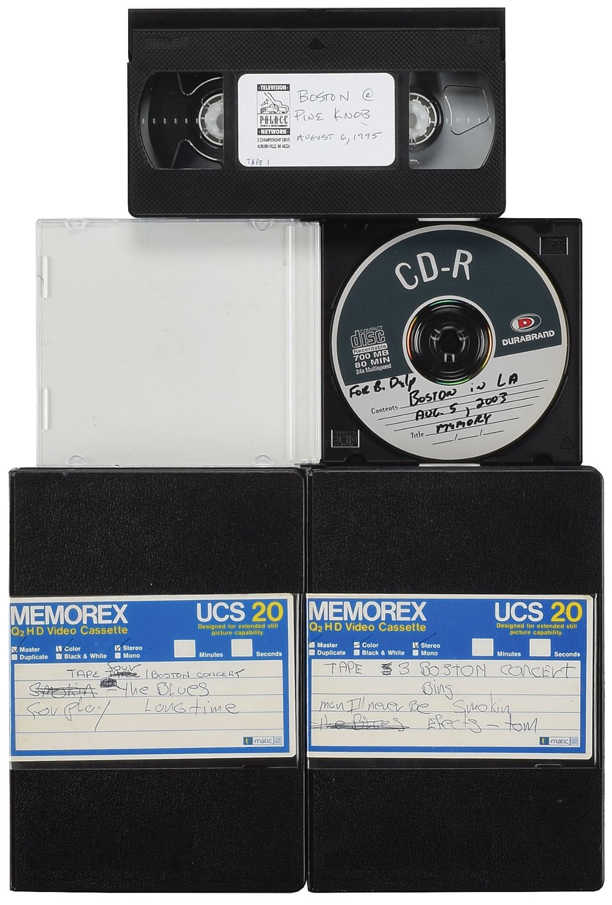 Group of three videocassette tapes from the collection of Brad Delp, including: two Memorex UCS 20 tapes, apparently marked on the labels in Delp's own hand with song titles indicating the contents, "Bing, Man I'll Never Be, Smokin" and "The Blues, Forplay, Longtime"; and a Maxell VHS tape with a Palace Sports & Entertainment Television Network label annotated in another hand, "Boston @ Pine Knob, August 6, 1995." Also includes a CD-R marked in another hand, "For B. Delp, Boston in LA, Aug. 5, 2003, Memory." In overall fine condition.
