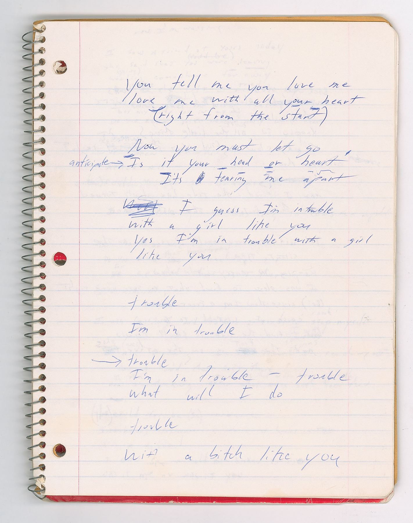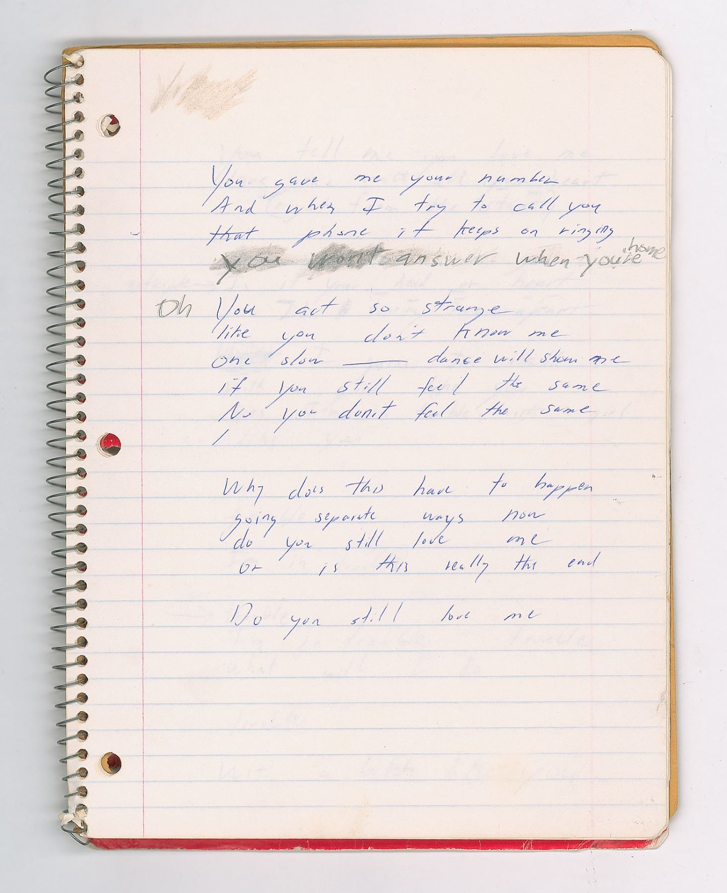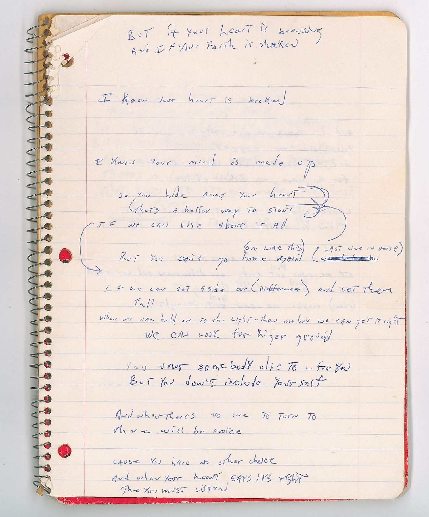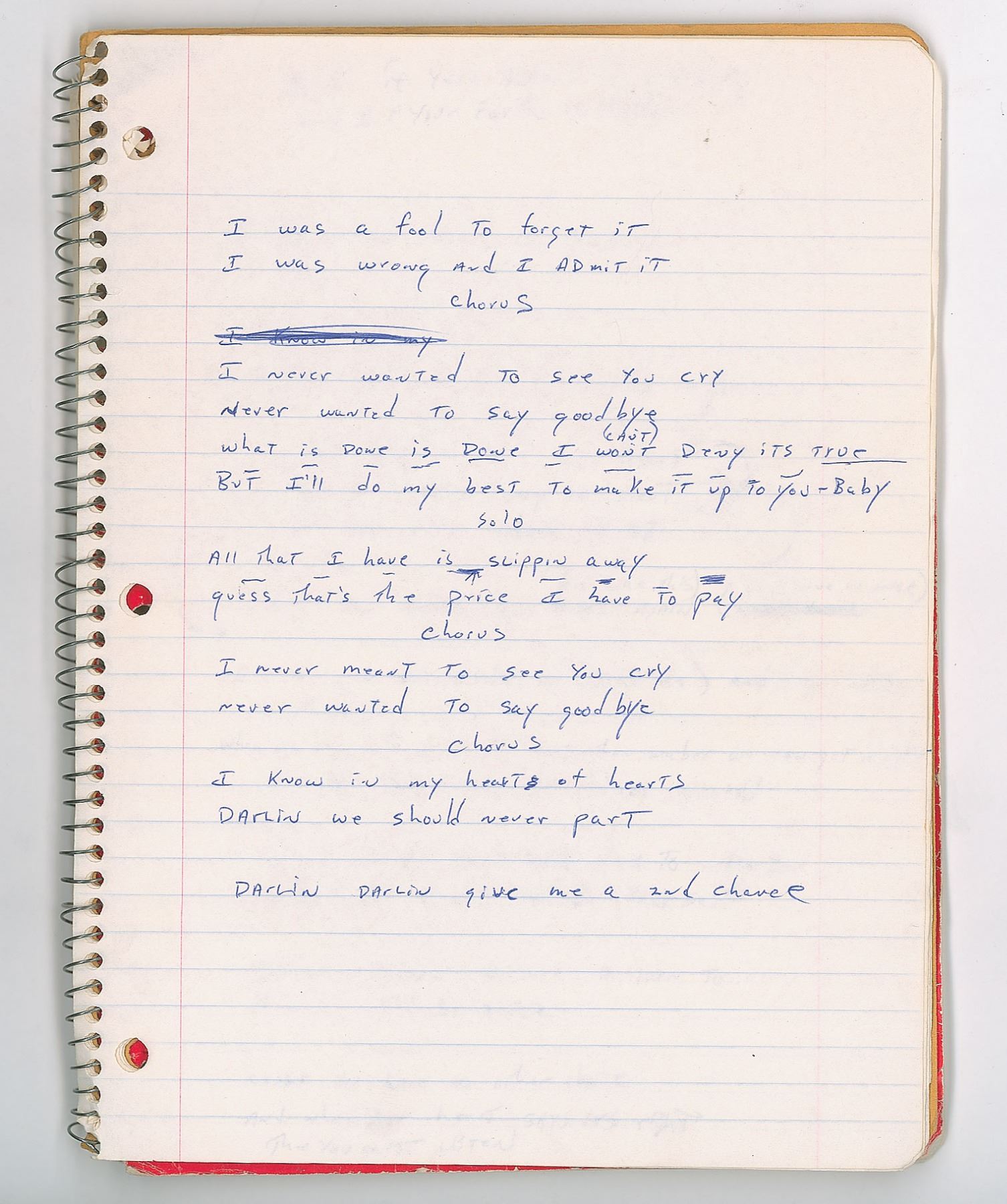 Brad Delp's red Mead songwriting notebook, 8 x 10.5, containing nine pages of his handwritten working lyrics on seven sheets, some of which appears to be unpublished material. These are predominately yearning ballads on unrequited love executed in Delp's typical lyrical style, with known songs including RTZ's 'Talk to Me' and 'Rise Above it All.' Some excerpts include: "You gave me your number / And when I try to call you / that phone it keeps on ringing"; "You tell me you love me / love me with all your heart / (right from the start) / Now you must let go / Is it your head or heart / It's tearing me apart"; "I know your heart is broken / I know your mind is made up / so you hide away your heart / That's a better way to start." On the back cover of the notebook, Delp has written an unusual series of words, which have been struck through—perhaps a free-association song-writing exercise. The notebook is thin, with many pages having been removed. In very good to fine condition, with some creasing, and other signs of use and wear.