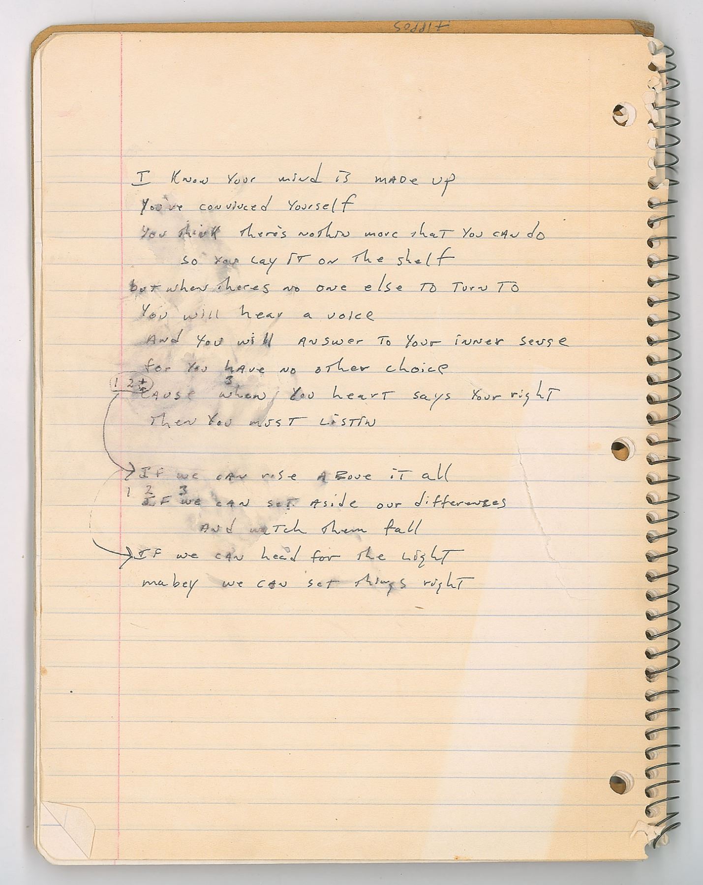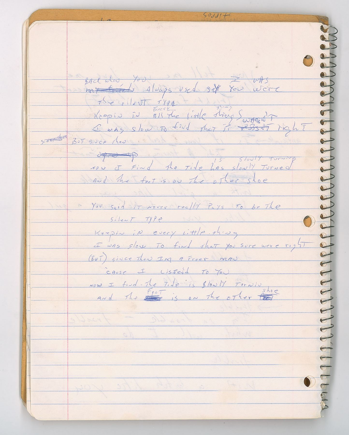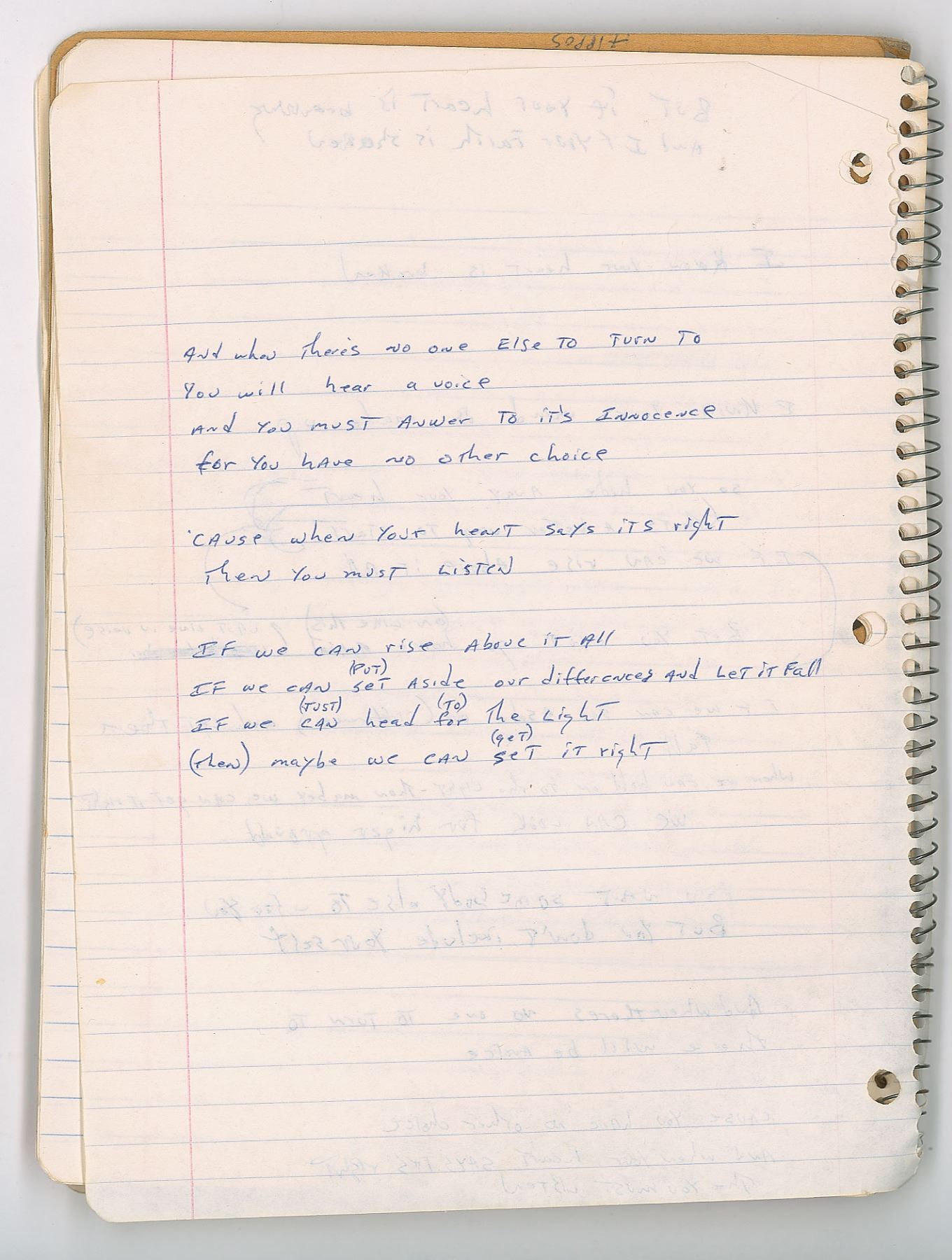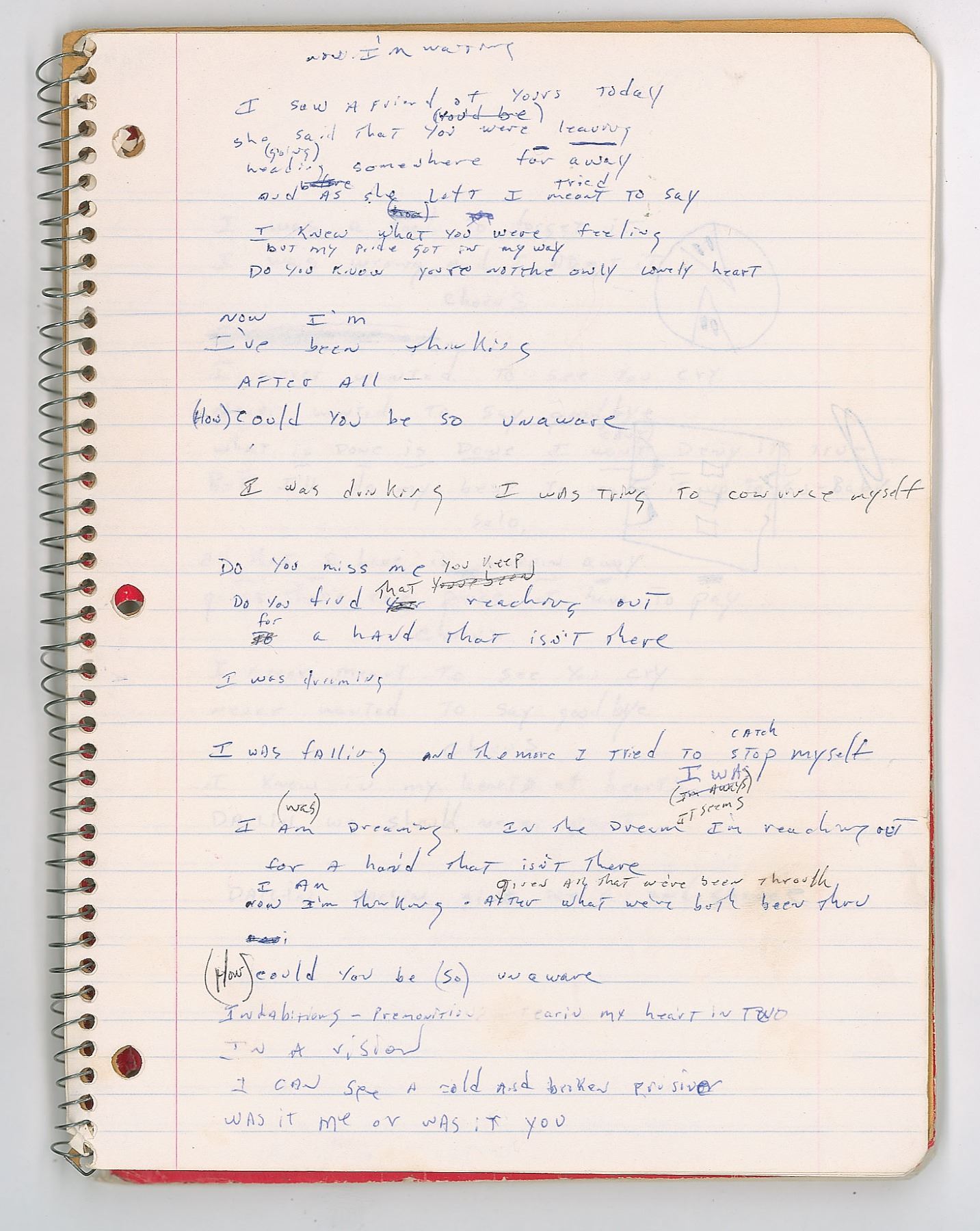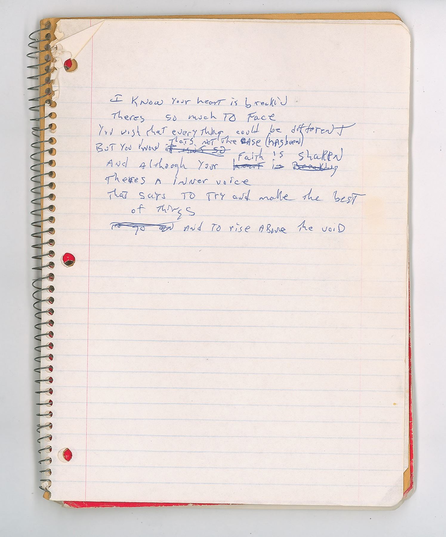 Brad Delp's red Mead songwriting notebook, 8 x 10.5, containing nine pages of his handwritten working lyrics on seven sheets, some of which appears to be unpublished material. These are predominately yearning ballads on unrequited love executed in Delp's typical lyrical style, with known songs including RTZ's 'Talk to Me' and 'Rise Above it All.' Some excerpts include: "You gave me your number / And when I try to call you / that phone it keeps on ringing"; "You tell me you love me / love me with all your heart / (right from the start) / Now you must let go / Is it your head or heart / It's tearing me apart"; "I know your heart is broken / I know your mind is made up / so you hide away your heart / That's a better way to start." On the back cover of the notebook, Delp has written an unusual series of words, which have been struck through—perhaps a free-association song-writing exercise. The notebook is thin, with many pages having been removed. In very good to fine condition, with some creasing, and other signs of use and wear.