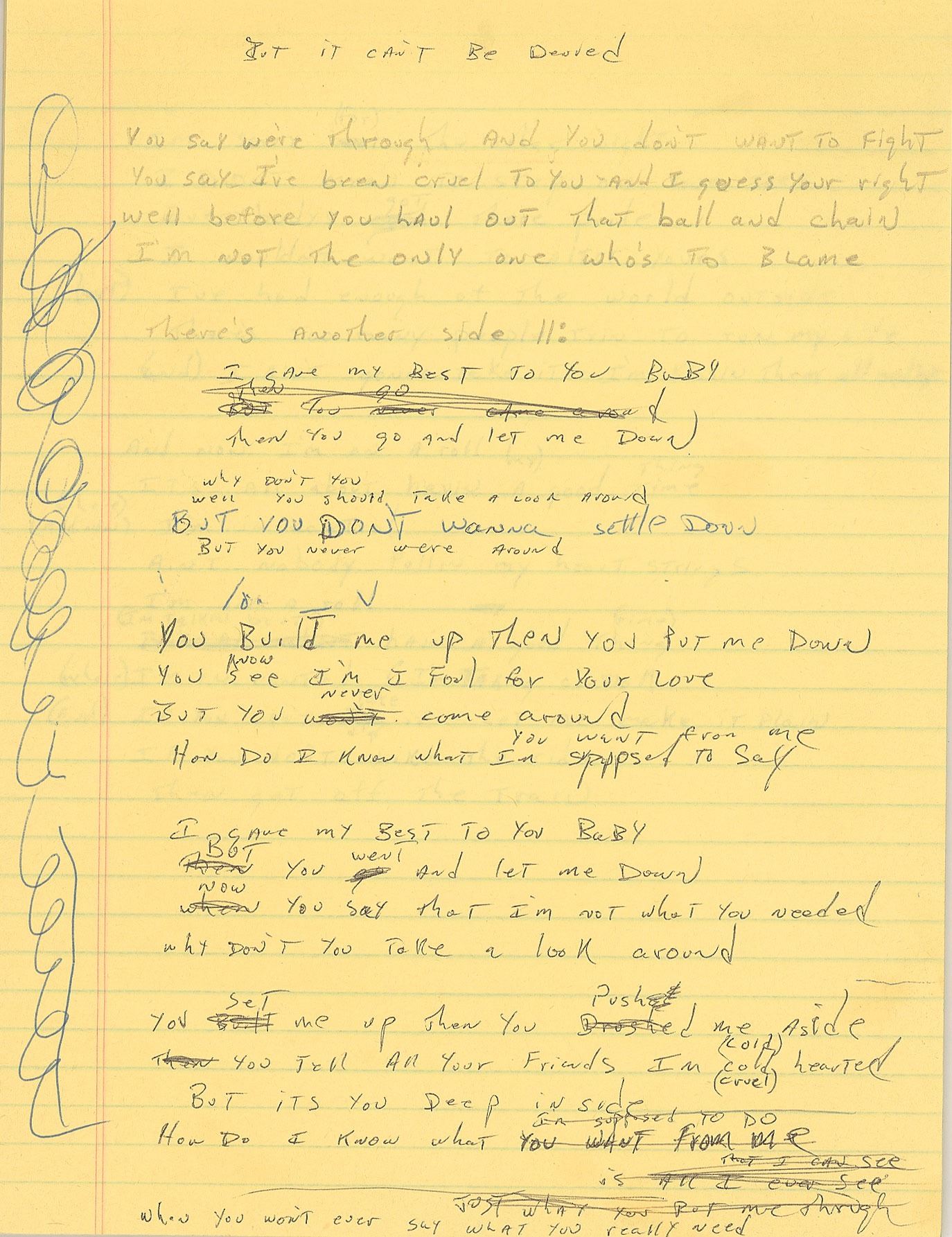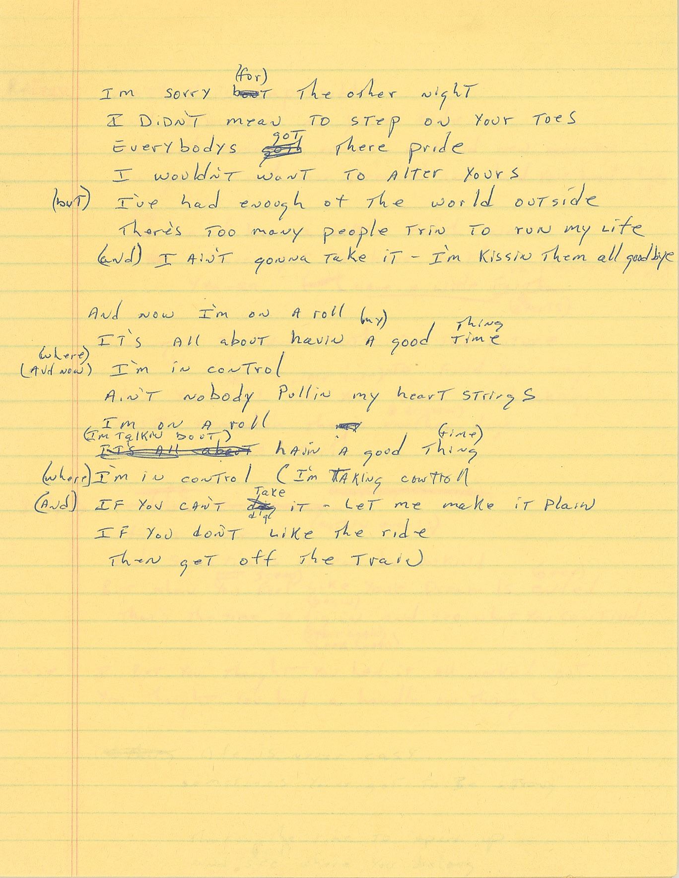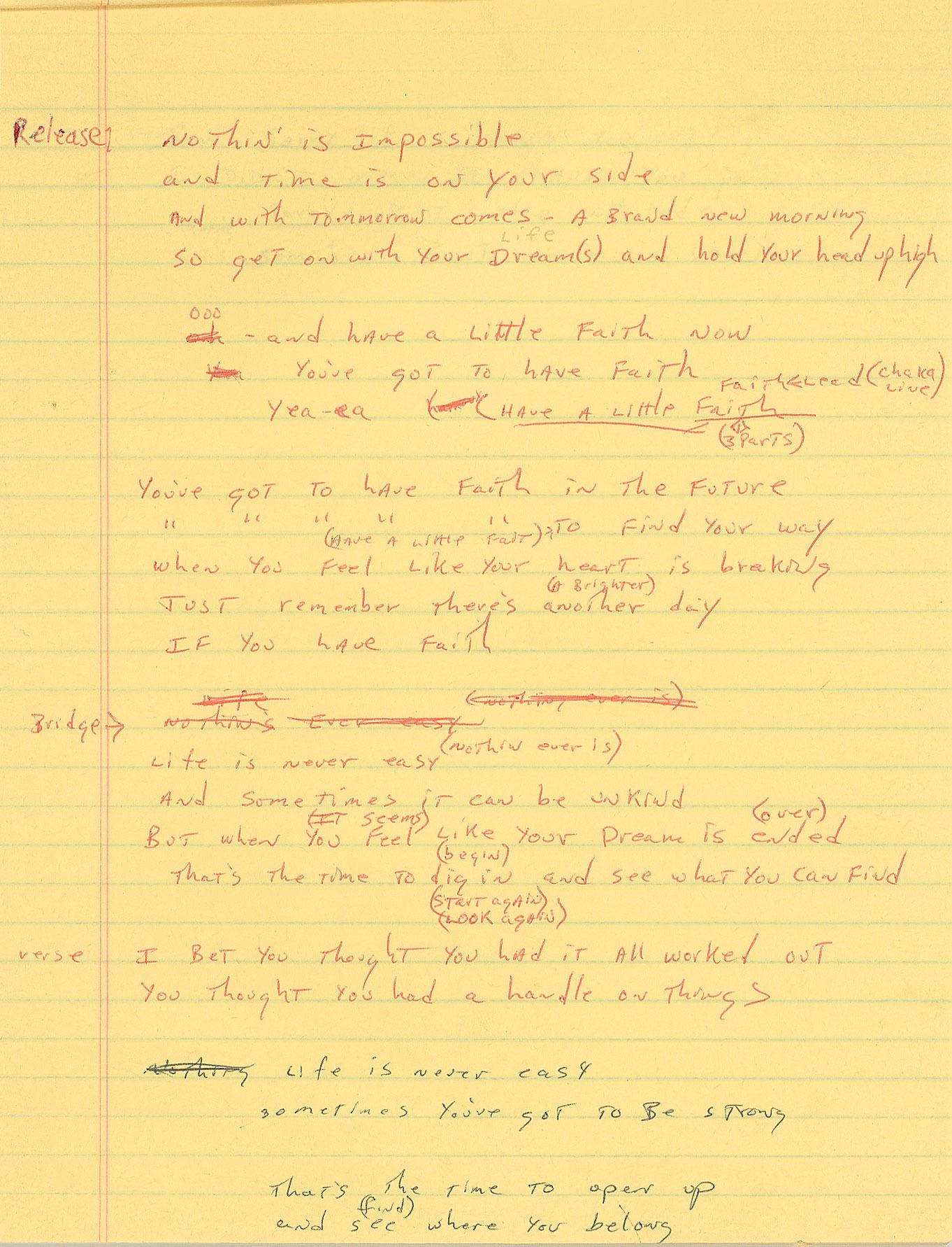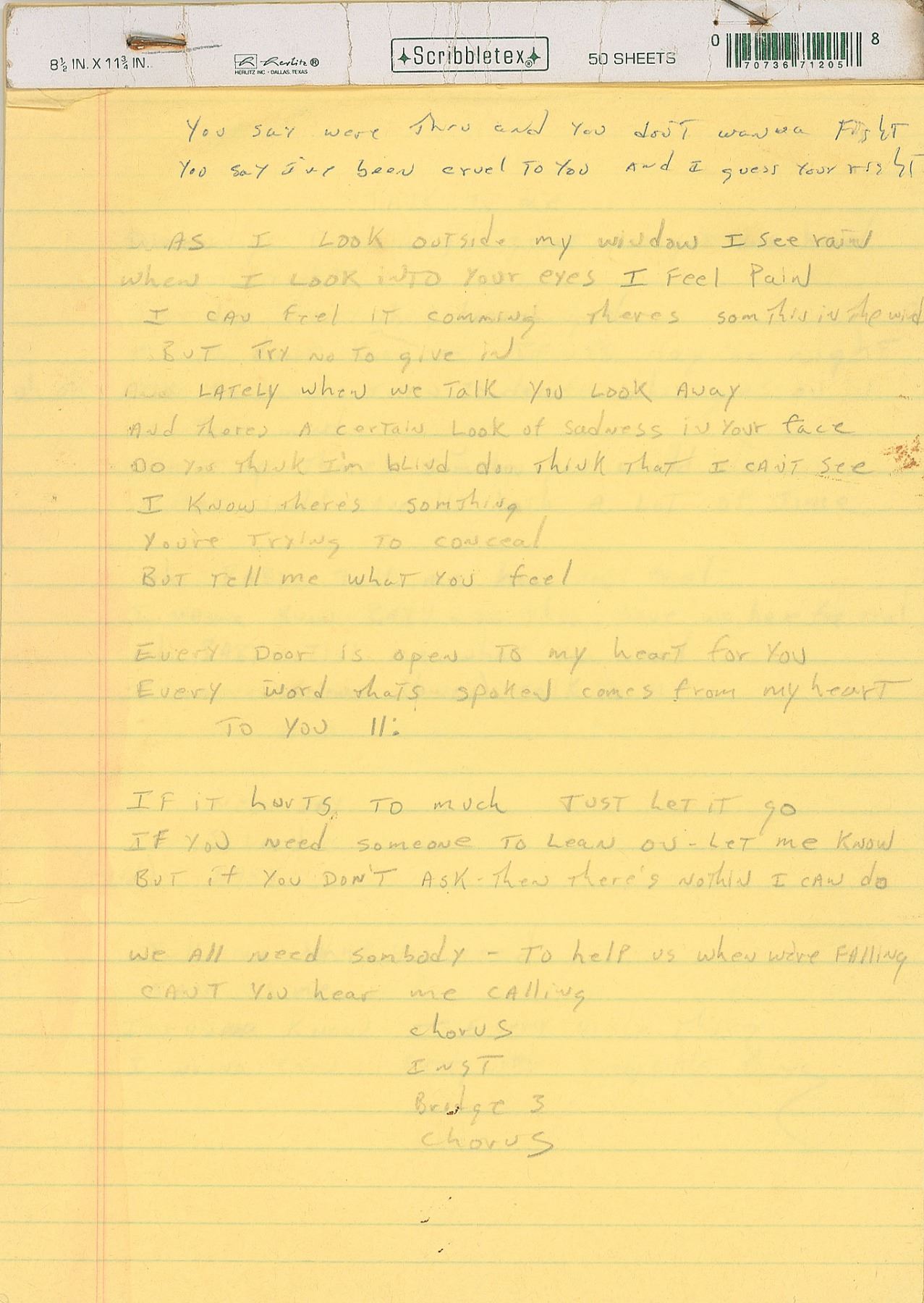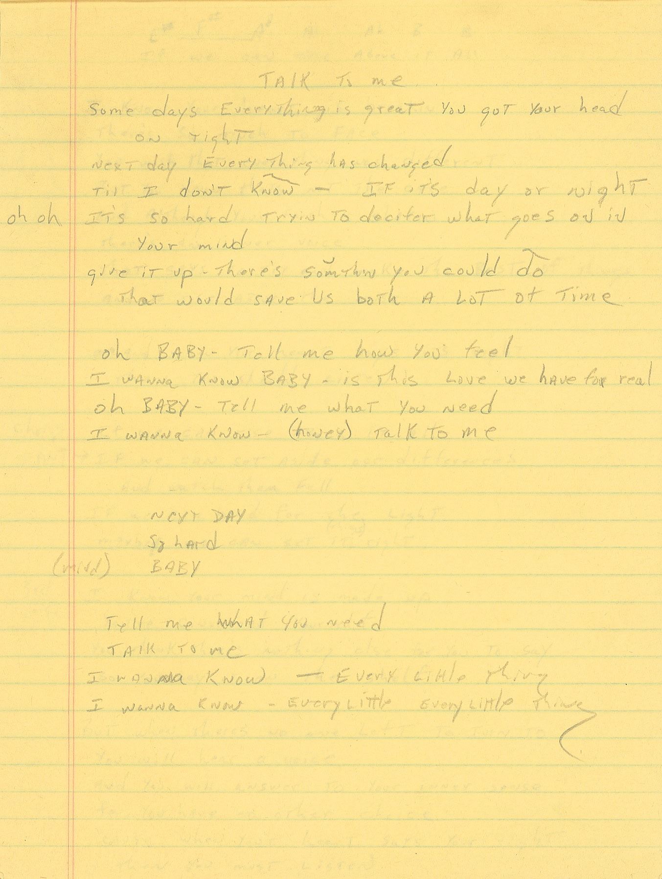 Brad Delp's yellow songwriting legal pad, 8.5 x 12, with the first eleven pages filled out in pencil and ballpoint with his handwritten working lyrics, some of which appears to be unpublished material. Known songs include RTZ's 'Every Door is Open,' 'Talk to Me,' 'Rise Above It All,' and 'I'm on a Roll.' Some excerpts include: "Nothin' is impossible / and time is on your side / and with tomorrow comes - a brand new morning"; "I'm sorry if I made you cry / I didn't mean to cause you pain / Sorry bout the attitude / It's somethin bout love in vain"; and "You say we're through and you don't want to fight / You say I've been cruel to you - and I guess your right / well before you haul out that ball and chain / I'm not the only one who's to blame." In fine condition, with general handling wear.