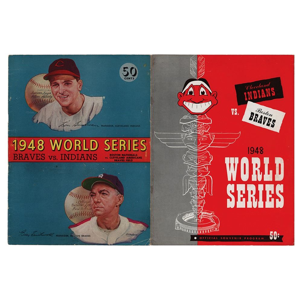 Desirable 'home and away' pairing of programs from the 1948 World Series between the Boston Braves and Cleveland Indians, 9 x 12, with both scorecards unscored. The program from Braves Field in Boston features opposing managers Billy Southworth and Lou Boudreau on the front cover, while the program from Cleveland Stadium boasts an image of Chief Wahoo atop a totem pole. In overall fine condition, with the centerfold detached inside the Boston program.