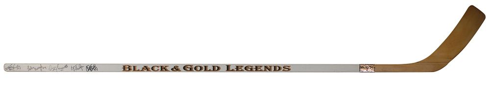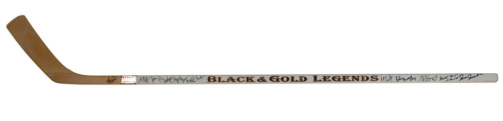 Official Sher-Wood Boston Bruins hockey stick signed in black felt tip on both sides of the shaft by 16 members of the Bruins. Signers include: Bob Beers, Ken Hodge, Pie McKenzie, Adam Oates, John Bucyk, Bob Sweeney, Milt Schmidt, and Gilles Gilbert. General wear to the paint on the stick, otherwise fine condition. Oversized.