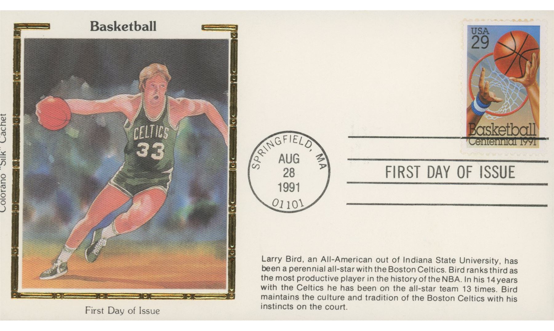 Boston Celtics Larry Bird Colorano "Silk" Cachet 1991 First Day Cover