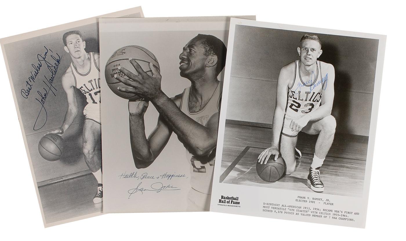 Three photos, various finishes, all approximately 8 x 10, each signed in ink or felt tip by the respective player pictured. Signers are: Sam Jones, John Havlicek (ins), and Frank Ramsey. In overall fine condition.