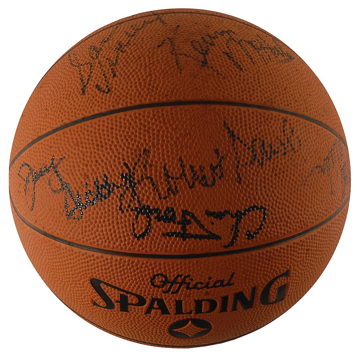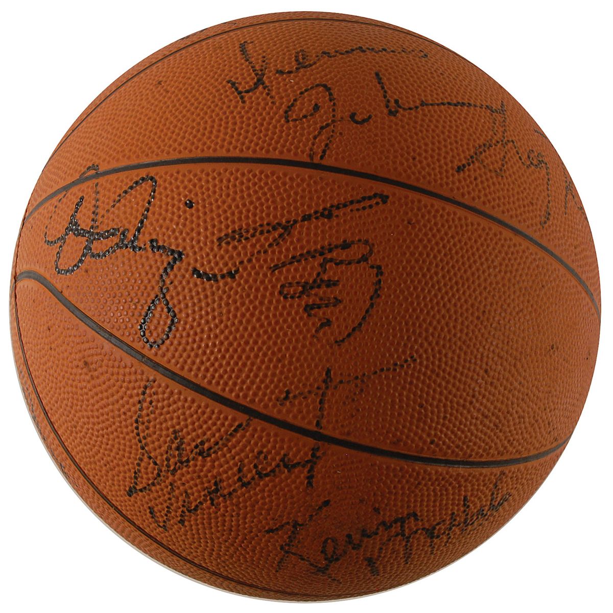 Official Spalding Larry Bird ‘Super Grip Series’ basketball signed in black felt tip on the side panels by 14 members of the 1985–86 Celtics championship team. Signers include: Larry Bird, Robert Parish, Kevin McHale, Bill Walton, Danny Ainge, K. C. Jones, Sam Vincent, Rick Carlisle, Greg Kite, Scott Wedman, and Jerry Sichting. Various scattered ink marks and a collector’s notation to one panel, otherwise fine condition.