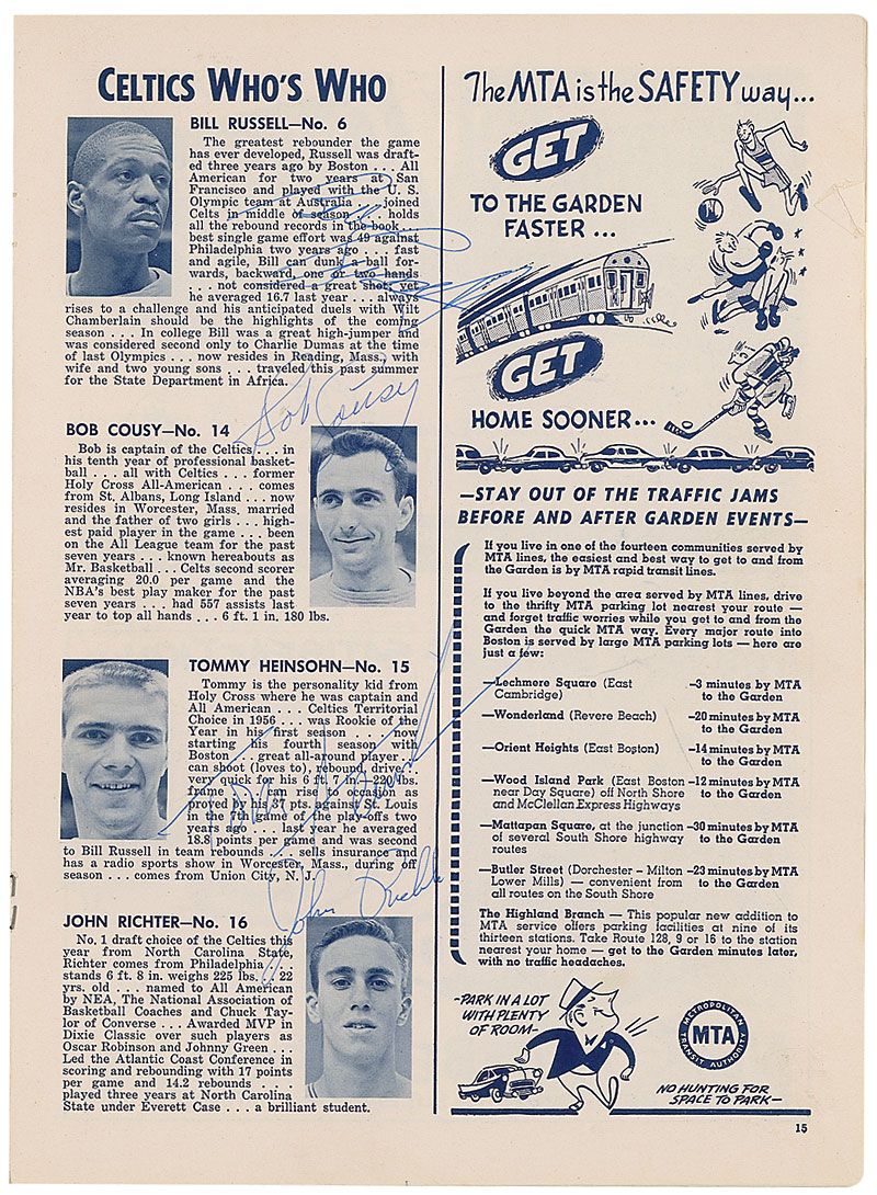 Vintage program for the 1959–60 Boston Celtics’ championship-winning season, 8 x 11, 22 pages, signed throughout in blue ballpoint by members of the Celtics team. Signers are: Bill Russell, Bob Cousy, Tommy Heinsohn, Bill Sharman, K. C. Jones, Frank Ramsey, John Richter, Gene Conley, Jim Loscutoff, and Bob Hopkins. Also signed on the reverse by Hal Greer. In very good condition, with partial separation and scattered creases to the front cover, and ballpoint notations to reverse.