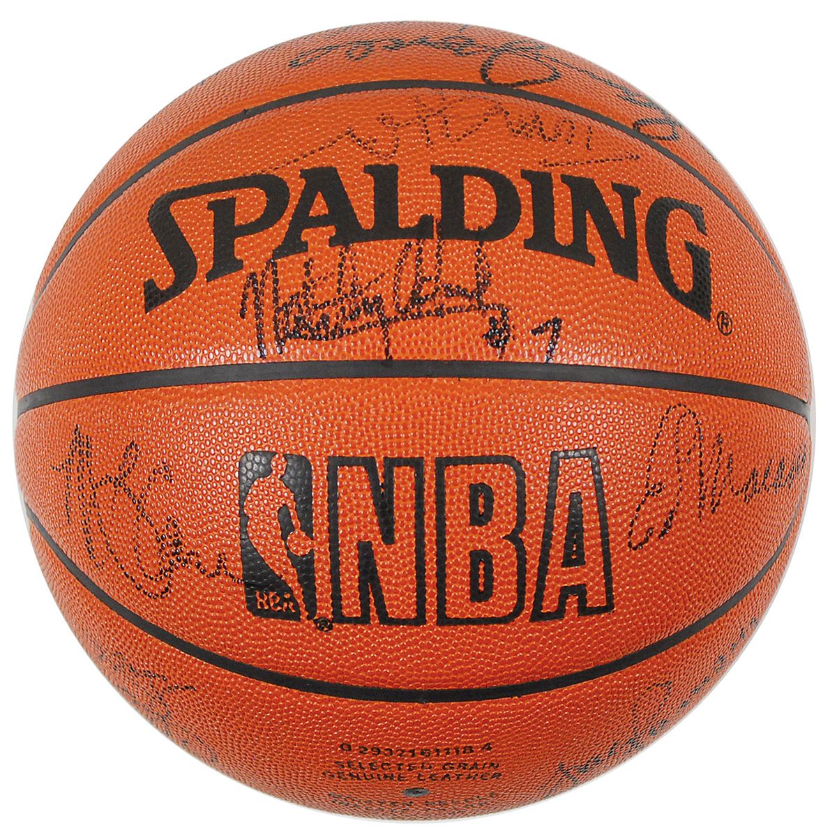 Official Spalding NBA basketball signed in black felt tip on the side panels by 17 Celtic greats, including Bill Russell, Larry Bird, Bob Cousy, Robert Parrish, ‘Tiny’ Archibald, Cedric Maxwell, Sam Jones, JoJo White, Bill Sharman, Satch Sanders, Jack Ramsay, Tommy Heinsohn, M.L. Carr, Bailey Howell, Ed Macauley, and two others. In fine condition.