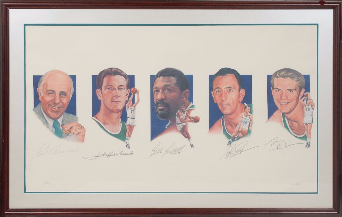 Color limited edition 35 x 20 lithograph entitled ‘Legacy I’, numbered 203/500, signed in pencil by Red Auerbach, John Havlicek, Bill Russell, Bob Cousy, and Tommy Heinsohn. Double-matted and framed to an overall size of 42 x 27. In fine condition.