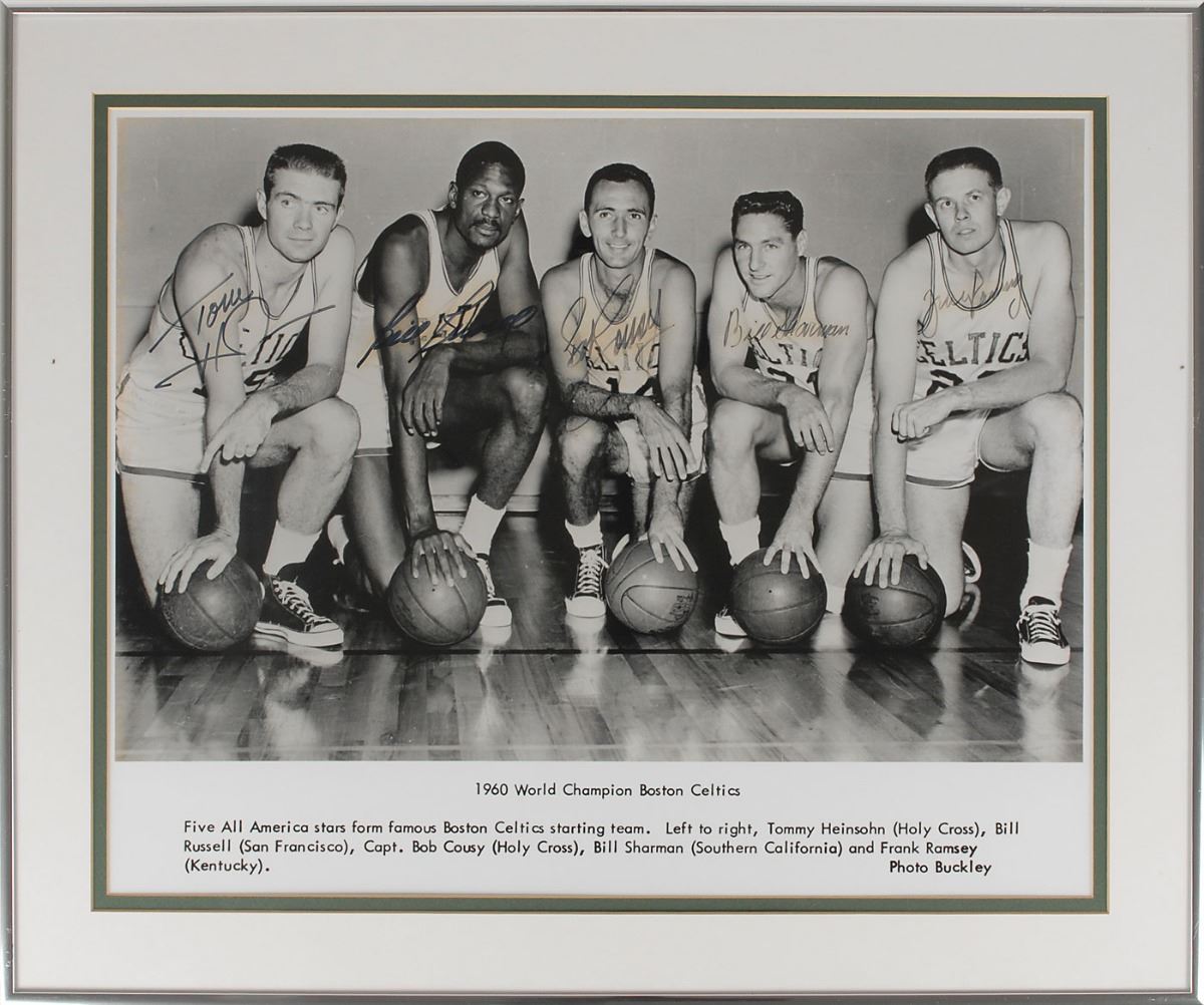 Awesome glossy 20 x 16 photo of the starting five of the 1960 World Champion Boston Celtics, signed in blue felt tip by all five: Bill Russell, Tom Heinson, Bob Cousy, Bill Sharman, and Frank Ramsey. In very fine condition.
