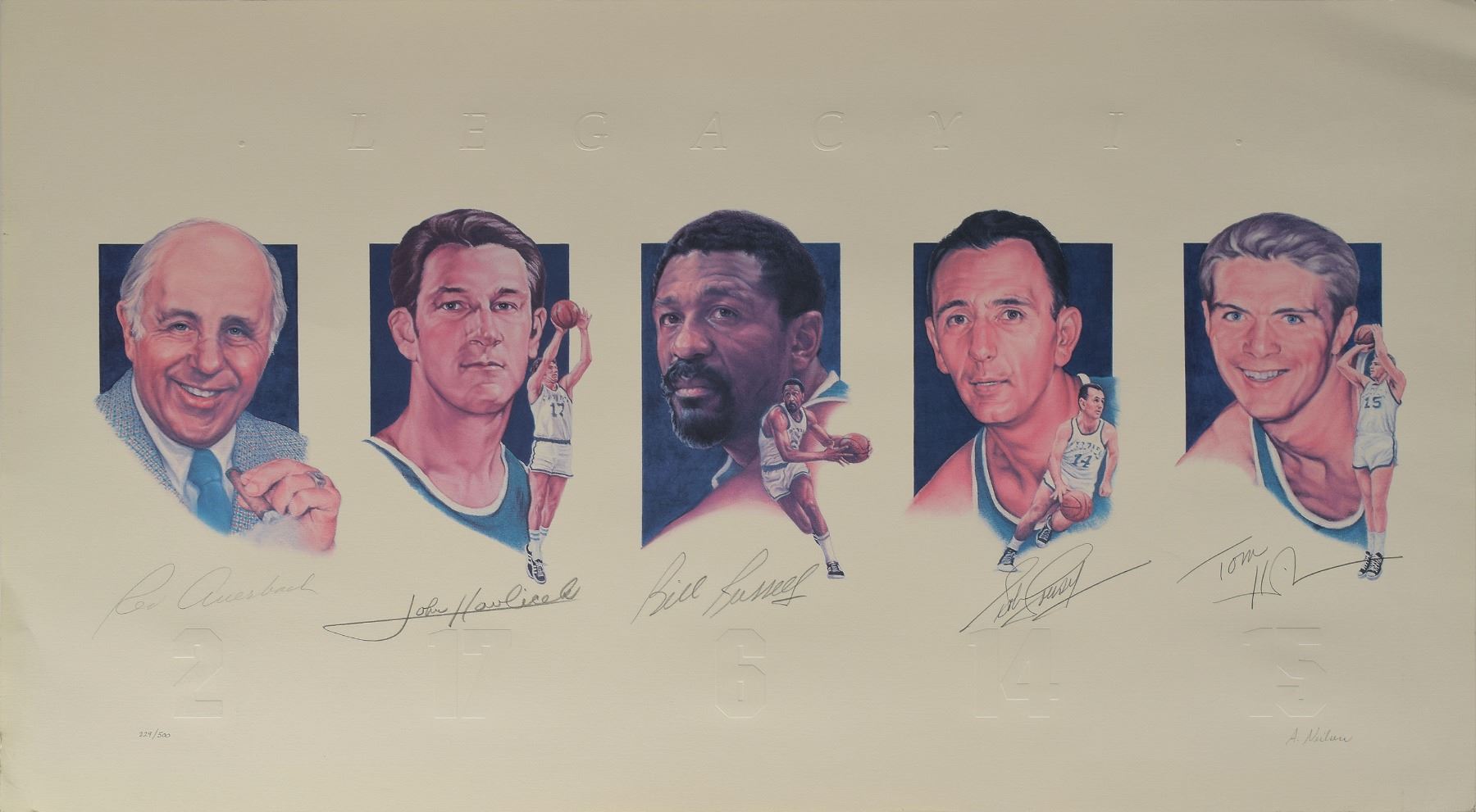 Color limited edition 39 x 22 lithograph entitled Legacy I, numbered 229/500, signed in pencil by Red Auerbach, John Havlicek, Bill Russell, Bob Cousy, and Tom Heinsohn. Also signed in pencil by the artist, Ann Neilsen. In fine condition, with some creasing to the left edge.