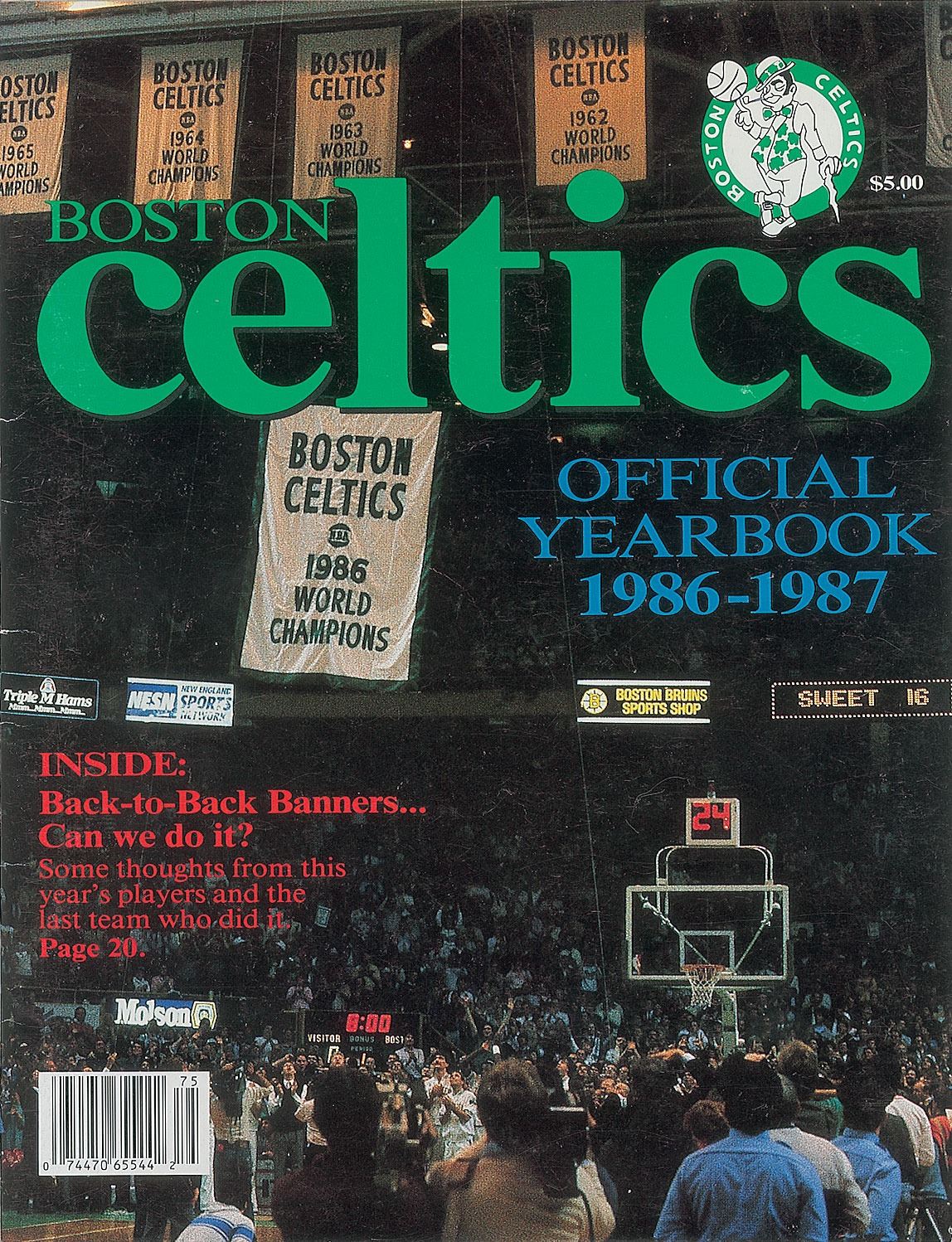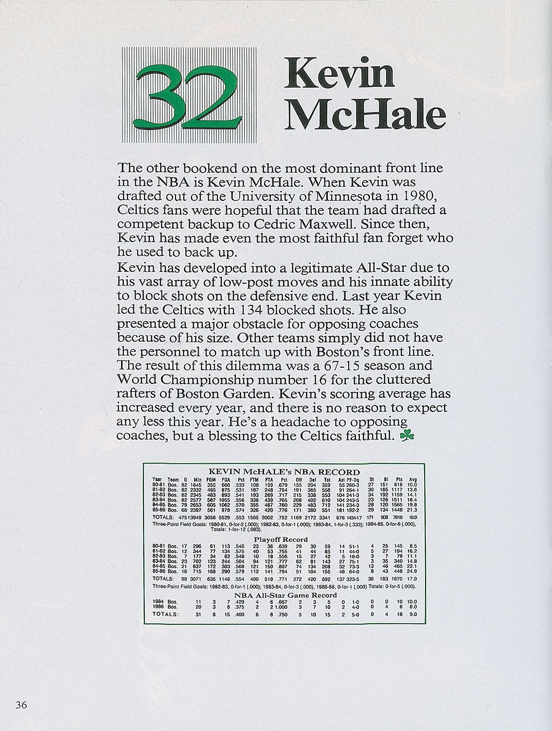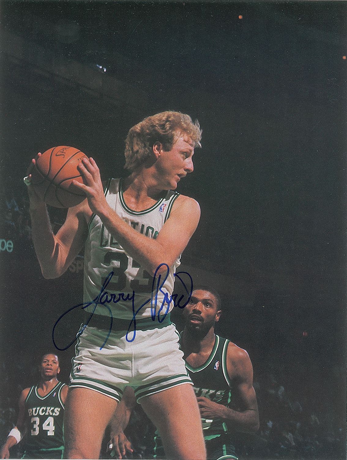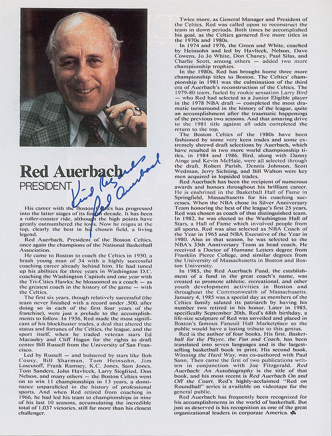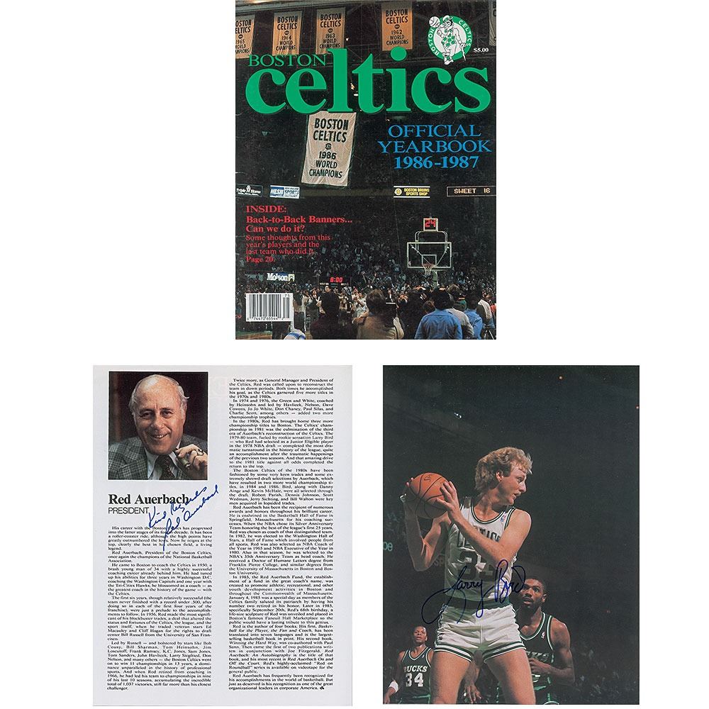 Official 1986–1987 regular season yearbook for the Boston Celtics, 64 pages, 8.5 x 11, signed inside on their respective biography pages in blue felt tip: Red Auerbach, Larry Bird, Kevin McHale, Robert Parish, Bill Walton, Dennis Johnson, Danny Ainge, Rick Carlisle, Jerry Sichting, Scott Wedman, Sam Vincent, K. C. Jones, Chris Ford, Greg Kite, Fred Roberts, Jan Volk, and Jim Rodgers. In fine condition.