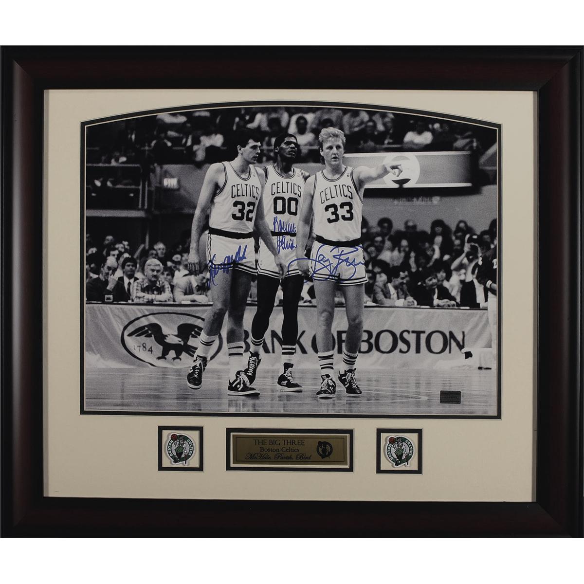 Satin-finish 19.5 x 14.5 photo of the Celtics original ‘Big Three’ in the Garden, signed in blue felt tip by Kevin McHale, Robert Parrish, and Larry Bird. Double matted and framed with two Celtic patches and a small plaque to an overall size of 27.5 x 23.5. In very fine condition. Oversized.