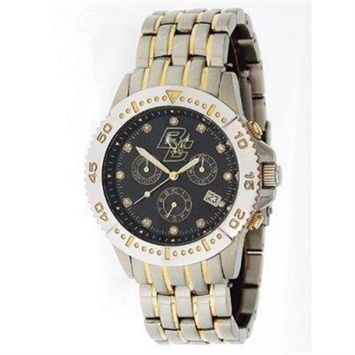 <P><STRONG>Boston College Eagles Game Time Legend Series Mens NCAA Watch<BR><BR>The FABULOUS Legend Diamond Chronograph Sport Watch<BR><BR>Features<BR>* Ronda Swiss 5040D Quartz Analog chronograph movement<BR>* Scratch resistant sapphire crystal <BR>* Solid stainless steel case<BR>* Stainless steel turning bezel with gold Arabic numerals and accents <BR>* Solid stainless steel bracelet in single link construction with fine brushed finish and gold accents <BR>* Double push-button buckle with safety clasp, etched with team logo<BR>* Ceramic dial with luminous hands and team logo<BR>* 12 Genuine VVS-G diamond indices featuring larger diamonds at 12, 3, 6, 9<BR>* Elapsed and split-time Chronograph, 1/10 second counter at 6 OÆclock, chronograph second hand in center, minute counter at 9:30 OÆclock <BR>* Second hand dial at 2:30 OÆclock, date at 4 OÆclock <BR>* Screw-in gold crown and gold chronograph push-buttons<BR>* Stainless steel screw down case back<BR>* Water resistant to 100 meters (330 ft) <BR>* Alternate black and brown genuine leather straps with stainless steel spring bars <BR>* Packaged in metal brief case with 23k gold plate etched with team logo<BR>* 5-year limited warranty</STRONG><BR><BR><STRONG>*Made to Order.<BR>*DELIVERY Time - 6 to 8 weeks from receipt of order!</STRONG></P><P></P>