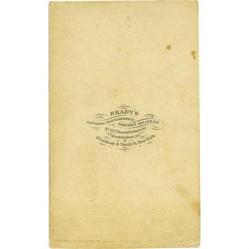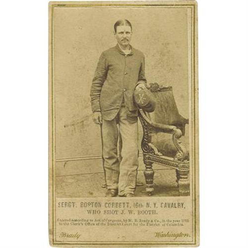 <B>Boston Corbett <I>Carte de Visite</B></I>.</B></I> A handsome Mathew Brady image of Boston Corbett. This true to life "mad hatter" shot and killed John Wilkes Booth. On April 26, 1865, Sergeant Boston Corbett of the 16th New York Cavalry raised his Colt revolver to shoot John Wilkes Booth. Lincoln's infamous assassin was cornered in a burning tobacco barn on the Virginia farm of Richard Garrett. Ignoring orders to take Booth alive, the over-zealous Corbett fatally wounded the fugitive with the justification that "God Almighty directed me." This photo shows Corbett standing near a chair, wearing his Union blues. The insignia and adornments are still visible on his hat. The crossed swords of the cavalry are in the center and the letter L surmounts them. Bears the Brady imprint on the recto and verso. Below the photograph it reads: "Sergt. Boston Corbett, 16th N.Y. Cavalry, Who Shot J.W. Booth." In fine condition; moderate soiling on the emulsion (appears that it could be cleaned); light overall toning on both sides; small stain near Corbett's feet; slightly bent corners; double lined gilt border; square corners.<BR><BR><b>Shipping:</b> Small Flat (<a target="_blank" href="http://www.heritageauctions.com/common/shipping.php">view shipping information</a>) <BR><BR><B>Important notice:</
