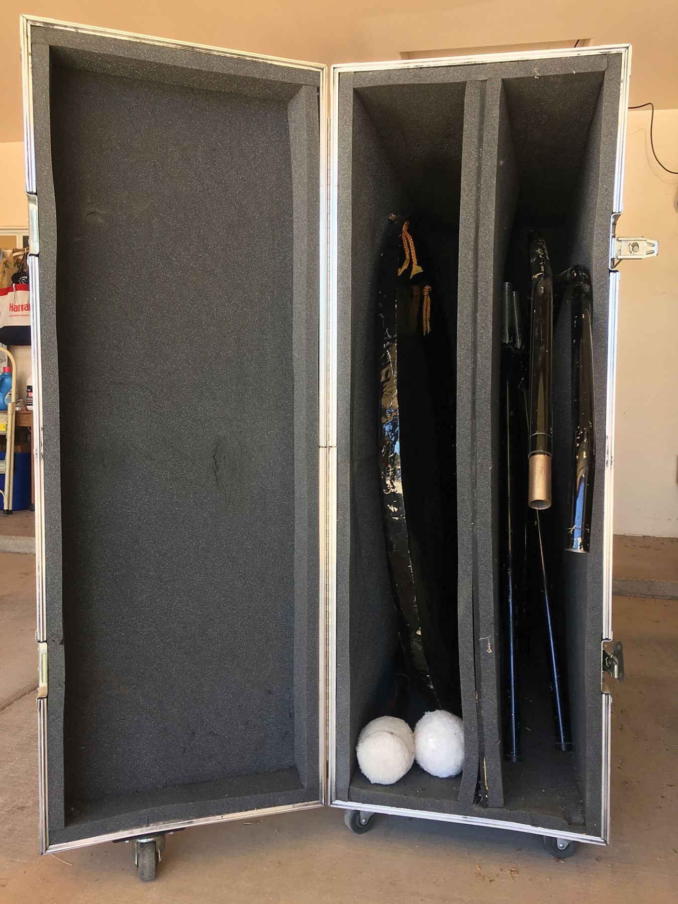 Impressive 46? Sabian stage gong with original mallets, stand, and touring case, used by drummer Curly Smith during Boston's Walk On and Livin' for You tours in 1995–1997. Formerly a member of the band Jo Jo Gunne and a well-respected session drummer, Smith became Boston's drummer in October 1994. In addition to his drumming duties, Smith played blues harp and provided backing vocals for Boston.
