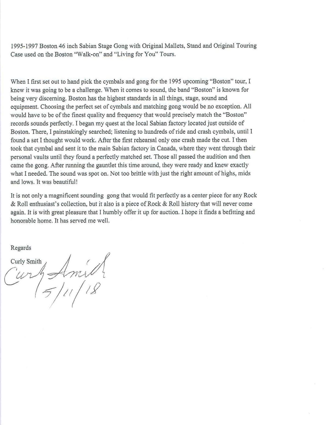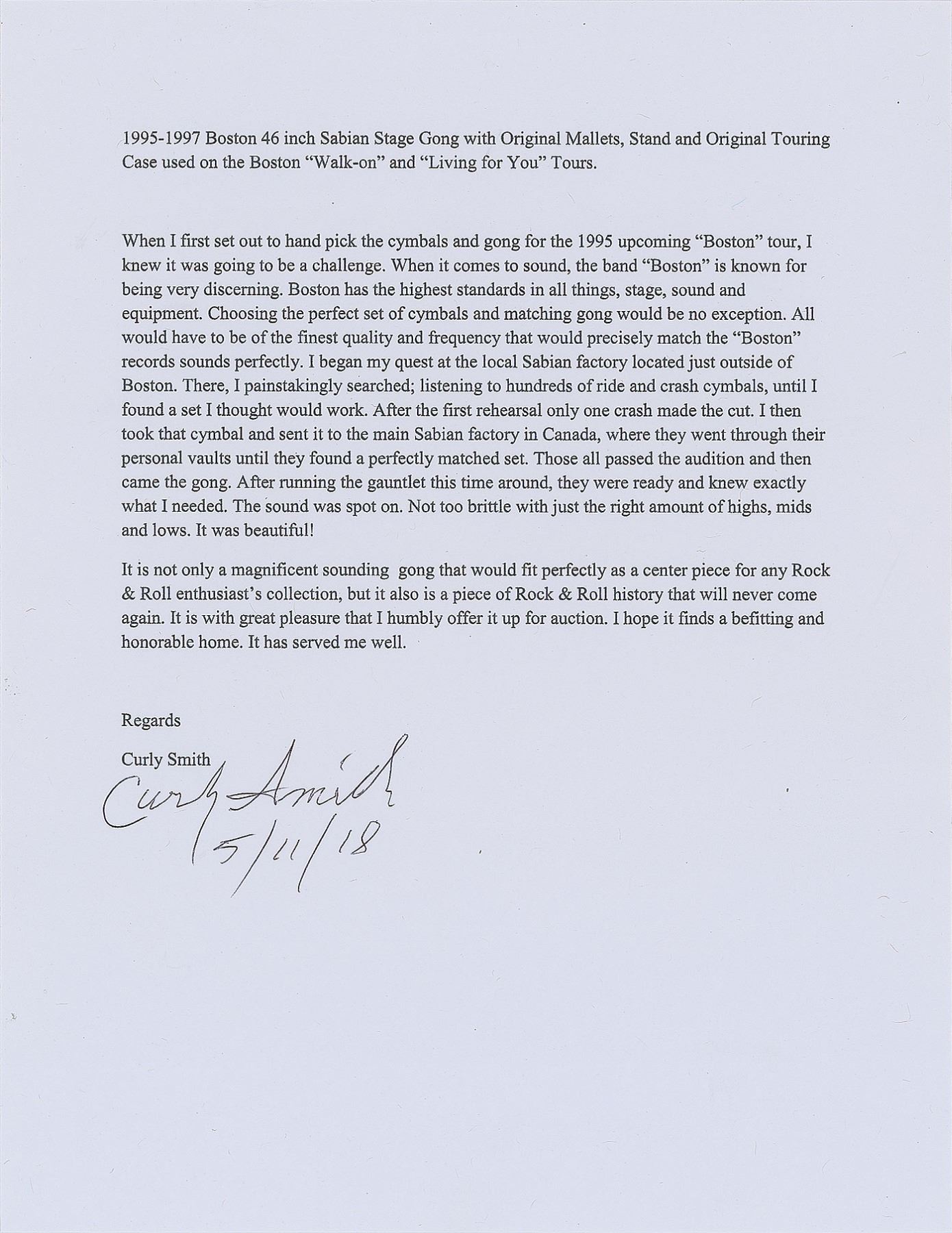 Accompanied by an image of the gong on stage with Boston, as well as a signed letter of provenance from Smith, in part: "When I first set out to hand pick the cymbals and gong for the 1995 upcoming 'Boston' tour, I knew it was going to be a challenge. When it comes to sound, the band 'Boston' is known for being very discerning. Boston has the highest standards in all things, stage, sound and equipment. Choosing the perfect set of cymbals and matching gong would be no exception. All would have to be of the finest quality and frequency that would precisely match the 'Boston' records sound perfectly. I began my quest at the local Sabian factory located just outside of Boston. There, I painstakingly searched; listening to hundreds of ride and crash cymbals, until I found a set I thought would work. After the first rehearsal only one crash made the cut. I then took that cymbal and sent it to the main Sabian factory in Canada, where they went through their personal vaults until they found a perfectly matched set. Those all passed the audition and then came the gong…The sound was spot on. Not too brittle with just the right amount of highs, mids and lows. It was beautiful! It is not only a magnificent sounding gong that would fit perfectly as a center piece for any Rock & Roll enthusiast's collection, but it also is a piece of Rock & Roll history that will never come again."