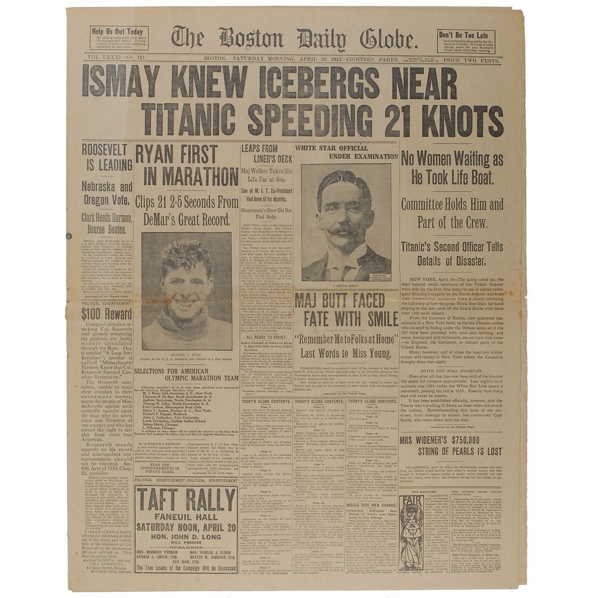Two newspapers: a complete April 20, 1912, issue of the Boston Post, with its banner headline stating, “Ismay Admits Titanic Was Racing 21 Knots An Hour,” with secondary headlines reading, “White Star Line Head Testifies Before Senate Committee—Denies He Went in First Boat, but Admits he was in Boat with Women…New Stories of Survivors Add to heroic Deeds—Astor and Maj. Butt in Forefront…Men of Band Played to the Very last”; and a complete April 20, 1912, morning edition of the Boston Daily Globe, with its banner reading, “Ismay Knew Icebergs Near Titanic Speeding 21 Knots,” with a portrait of Ismay under the headline. Uniform toning, central vertical fold, some scattered light foxing, and some trivial edge tears, otherwise fine condition.
