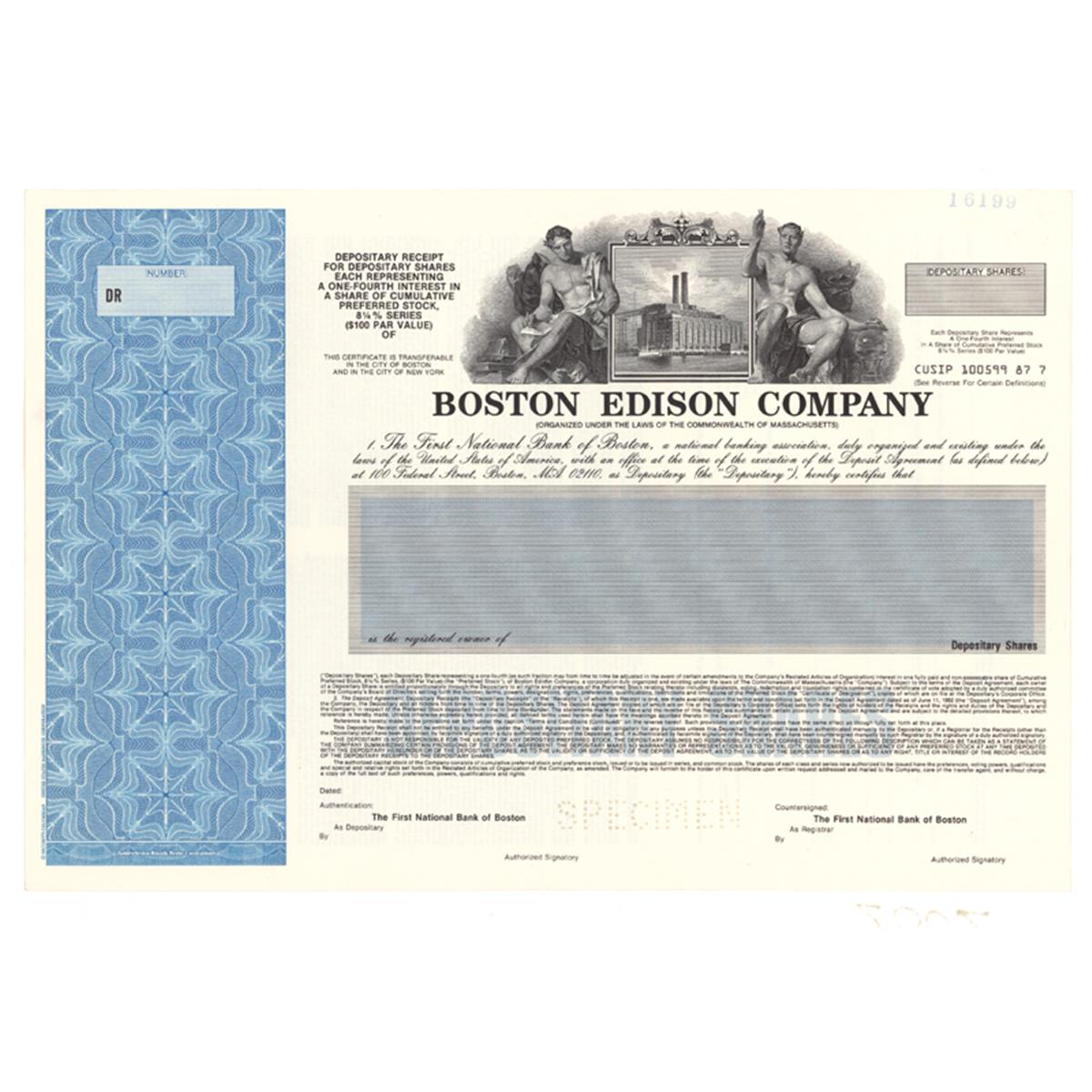 [Specimen] ----, Massachusetts. Depository Receipt specimen in Boston Edison Company. Blue / Black. Vignette of allegorical males flanking an inner vignette of the company headquarters. Perforation cancellation at bottom center. Very Fine.