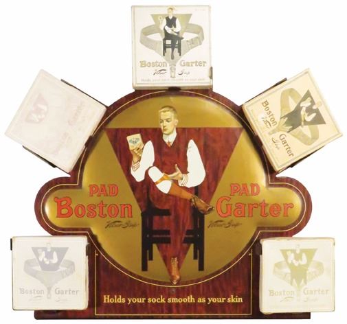 Boston Garter Die Cut Tin Store Easel Back Display. Comes with product boxes. A few minor blemishes otherwise very good condition. 17 1/2 X 16 1/2 X 10 inches.