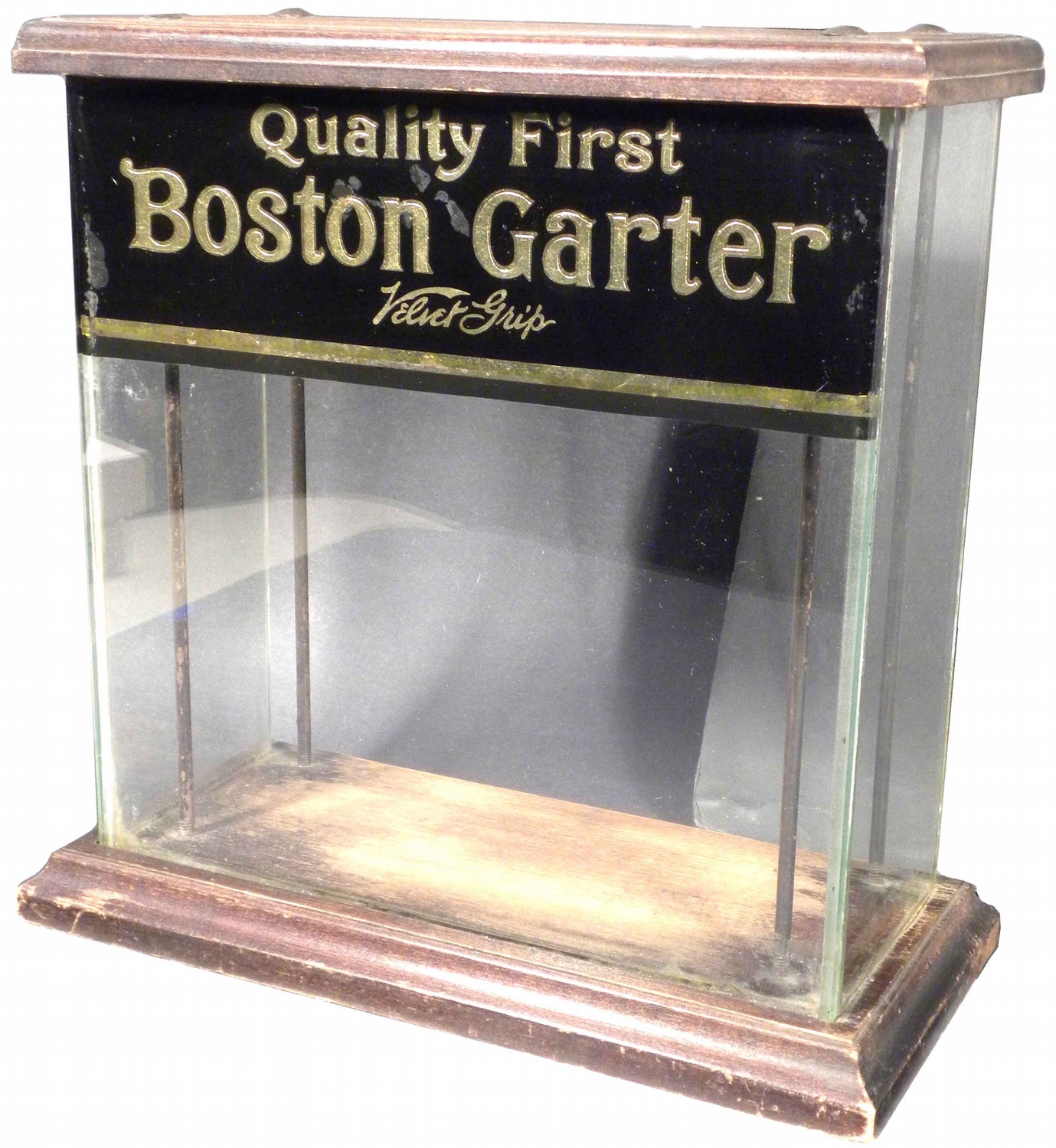 Boston Garter Store Display Case. Reverse glass marquee. Wood and glass. Excellent condition. 14 X 14 X 6 inches.