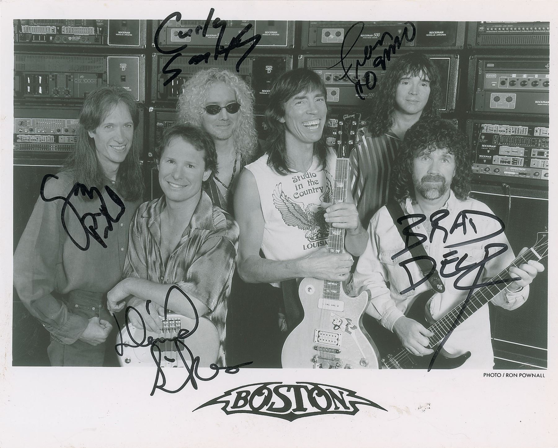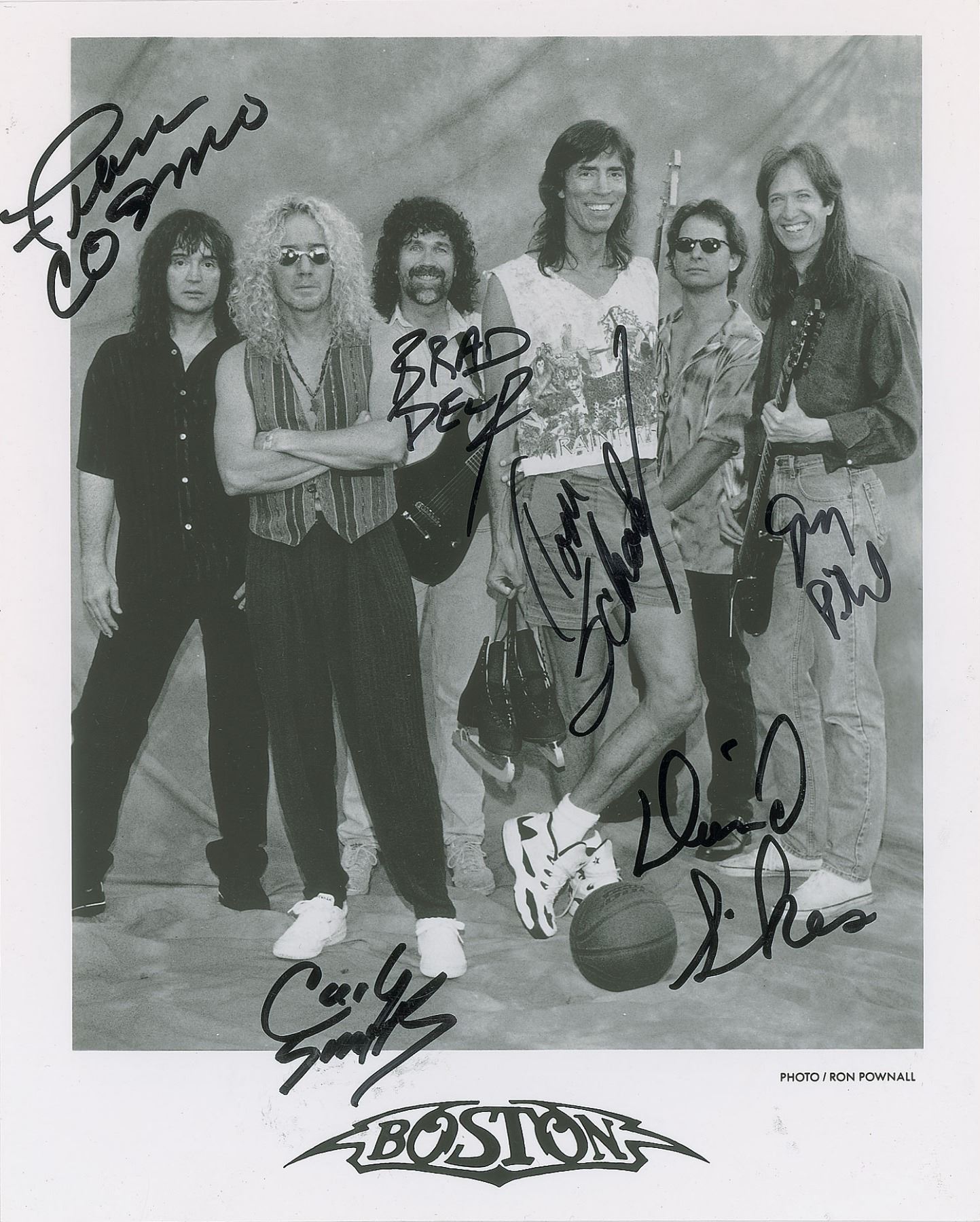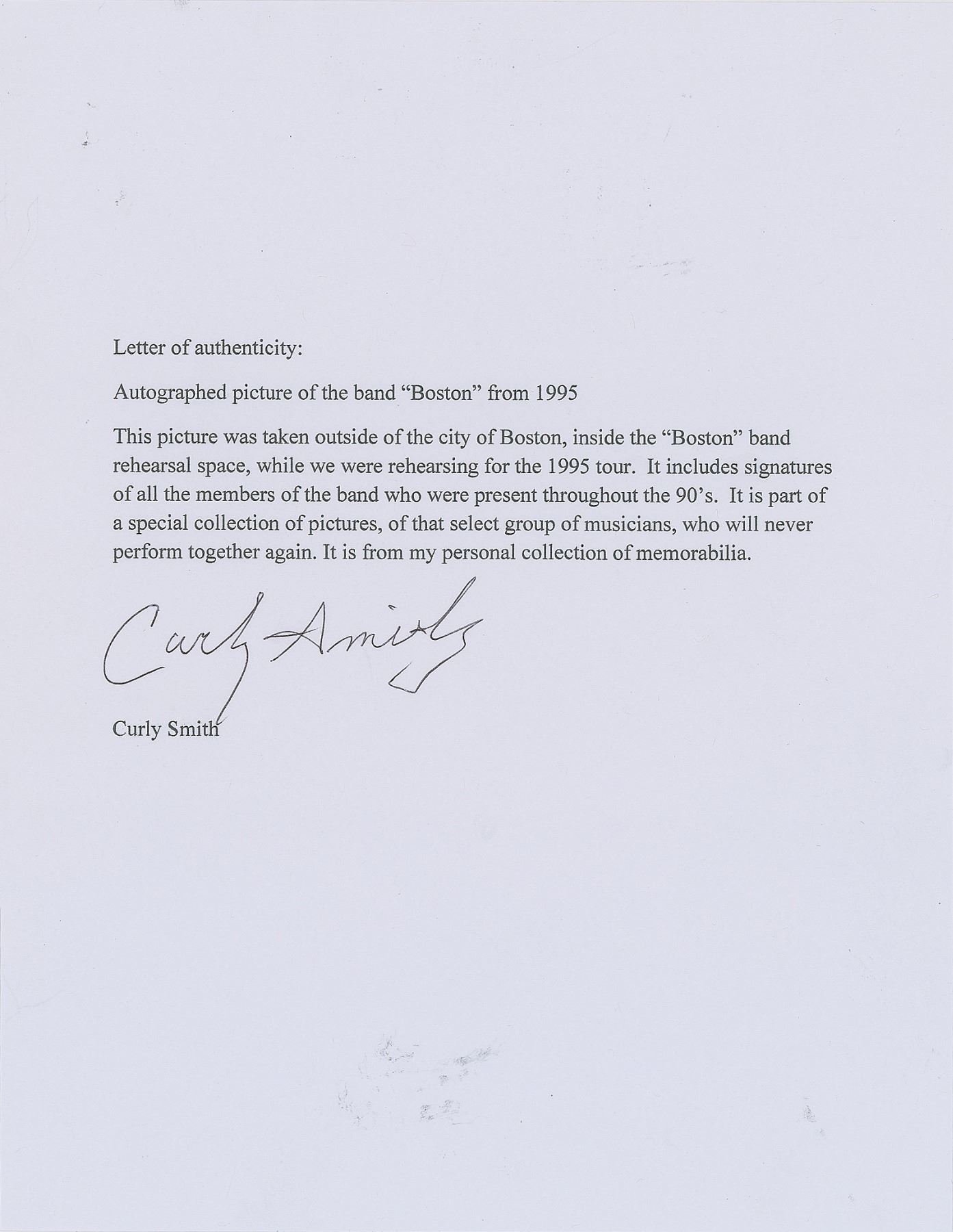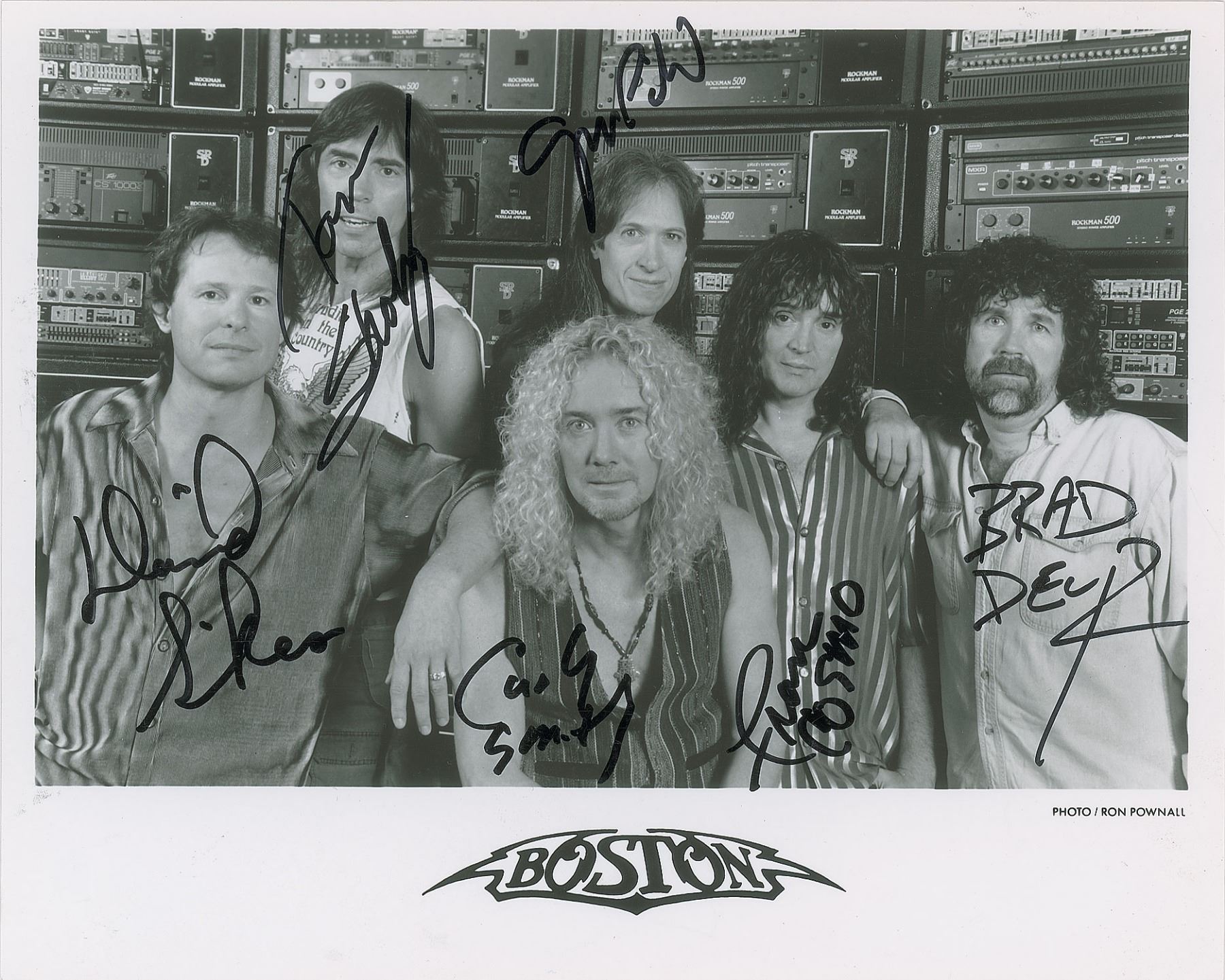 Group of three official glossy Boston publicity photos from 1995, from the personal collection of Boston drummer Curly Smith. Includes: an 8 x 10 photo signed by Brad Delp, Tom Scholz, Gary Pihl, Fran Cosmo, David Sikes, and Curly Smith; a 10 x 8 photo signed by Delp, Scholz, Pihl, Cosmo, Sikes, and Smith; and a 10 x 8 photo signed by Delp, Pihl, Cosmo, Sikes, and Smith. In fine condition, with a few light creases. Accompanied by three letters of authenticity signed by Smith. Formerly a member of the band Jo Jo Gunne and a well-respected session drummer, Smith became Boston's drummer in October 1994. In addition to his drumming duties, Smith played blues harp and provided backing vocals for Boston.