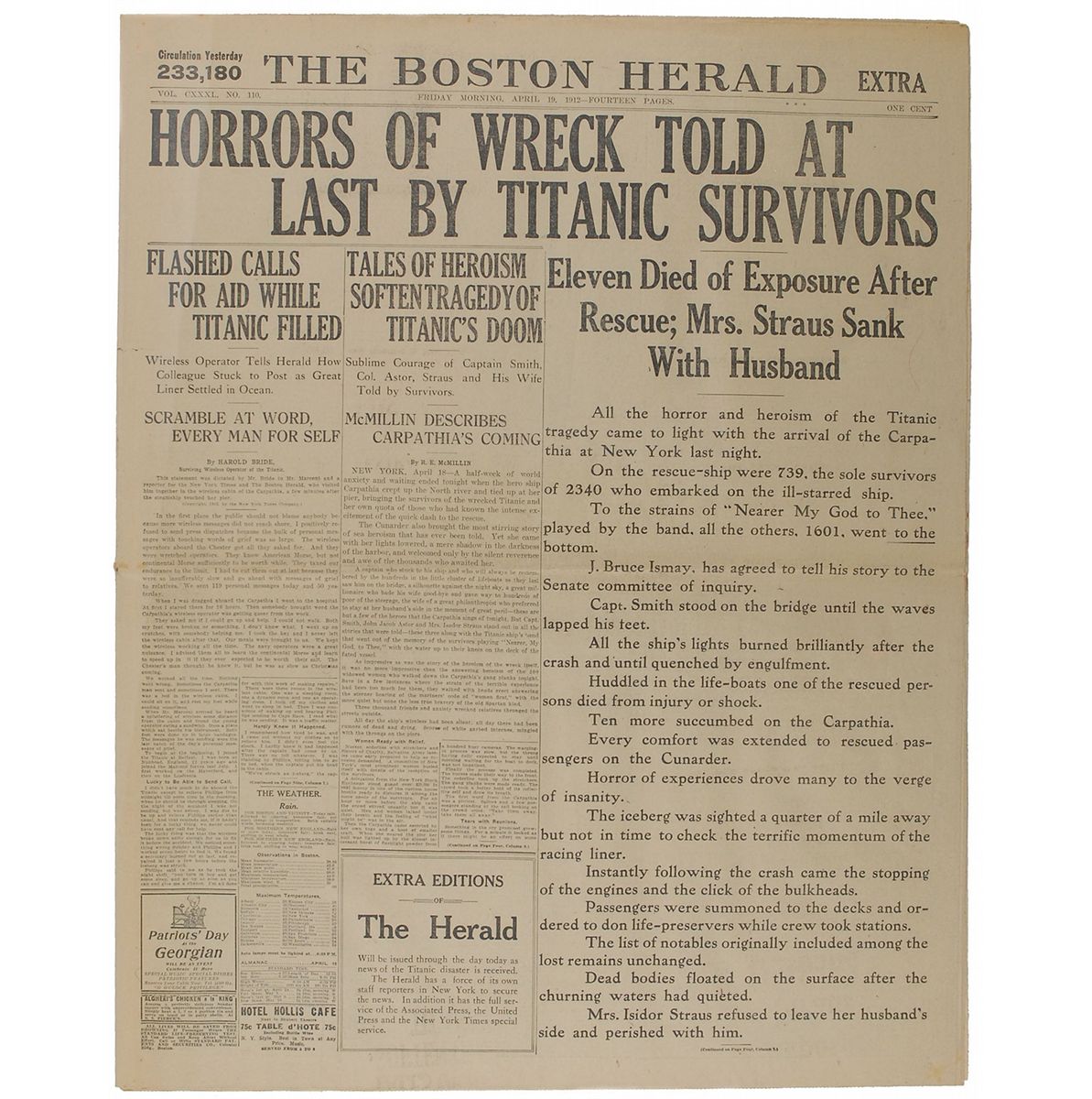 Original and complete April 19, 1912, extra edition of The Boston Herald, 18.25 x 23.25, with the front page taken up with reports of the sinking. Banner headline states, “Horrors of Wreck Told At Last By Titanic Survivors,” with some secondary headlines reading, “Capt. Smith stood on the bridge until the waves lapped his feet,” “Horror of experiences drove many to the verge of insanity,” and “Mrs. Isidor Straus refused to leave her husband’s side and perished with him.” Uniform toning, central horizontal fold, and some scattered light edge wear.
