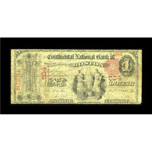 <B>Boston, MA</B></I> - $1 1875 Fr. 384 <B>The Continental NB</B></I> Ch. # 524<BR><B>Very Good,</B></I> with considerable soiling and a few scattered pinholes along with a touch of margin roughness.<BR><BR><b>Shipping:</b> Coin/Currency (<a target="_blank" href="http://www.heritageauctions.com/common/shipping.php">view shipping information</a>)