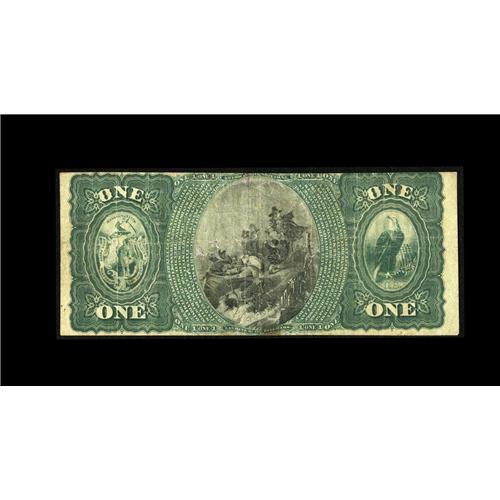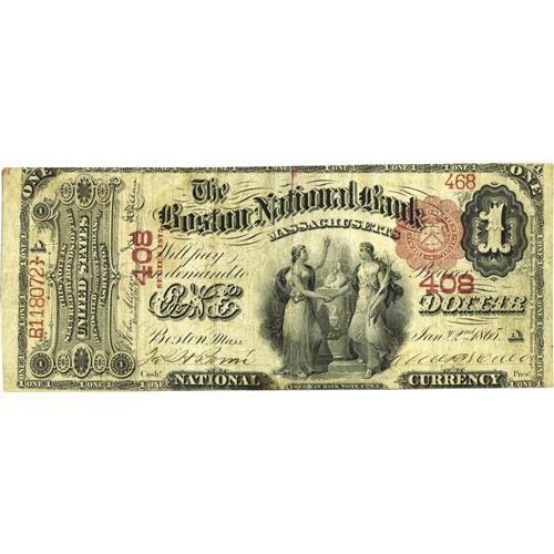 <B>Boston, MA</B></I> - $1 1875 Fr. 385 <B>The Boston NB</B></I> Ch. # 408<BR>This Boston issuer did not make it to the 20th Century, failing in 1898. It served this Northeastern city well, issuing more than $3.5 Million in National Currency. Government records show less than one half of one percent of the total issue was still outstanding in 1910, a number which probably declined very quickly in years approaching the switch to small size notes. This is a most eye appealing <B>Fine</B></I> though little care was taken when it was cut from the sheet, cutting into a millimeter of the design at top and bottom.<BR><I>From The Jeffrey L. Olyan Collection, Part 1</B></I>