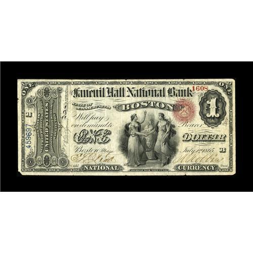 <B>Boston, MA</B></I> - $1 Original Fr. 380 <B>The Faneuil Hall NB</B></I> Ch. # 847<BR>The colors, paper, and overprint are all as bold as anyone could expect for the grade. Interestingly this bank issued nearly every denomination of Original Series (including $500's), Series 1875, Brown Backs, and Red Seals. Today however, there are only about a dozen and half aces and deuces known, all of which saw heavy use. A few splits are noted in the margins. <B>Very Fine.</B></I><BR><I>From The Bill and Kathy Stella Currency Collection</B></I><BR><BR><b>Shipping:</b> Coin/Currency (<a target="_blank" href="http://www.heritageauctions.com/common/shipping.php">view shipping information</a>)