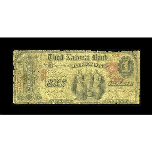 <B>Boston, MA</B></I> - $1 Original Fr. 382 <B>The Third NB</B></I> Ch. # 359<BR>A <B>Good</B></I> example with considerable circulation soiling and margin roughness all around. While the signatures remain intact, they are obscured by the extensive paper wrinkling. Not the prettiest note, but certainly a scarce issue from here, with just three of this denomination and type now documented.<BR><BR><b>Shipping:</b> Coin/Currency (<a target="_blank" href="http://www.heritageauctions.com/common/shipping.php">view shipping information</a>)