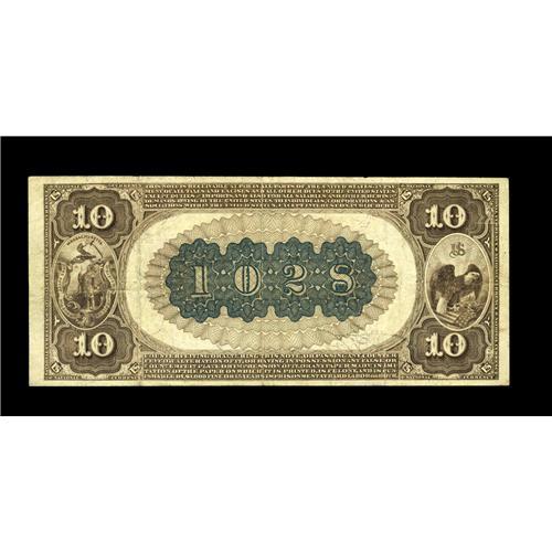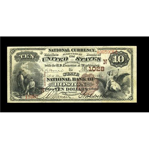<B>Boston, MA</B></I> - $10 1882 Brown Back Fr. 481 <B>The State NB</B></I> Ch. # (N)1028<BR>A scarce Boston bank which went out in 1912. Interestingly, this attractive Brown Back is the only $10 note of any type reported from here. Bright <B>Very Fine,</B></I> with bold black signatures.
