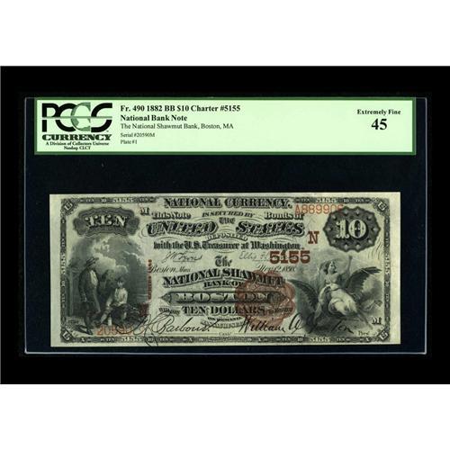 <B>Boston, MA</B></I> - $10 1882 Brown Back Fr. 490 <B>The National Shawmut Bank</B></I> Ch. # (N)5155<BR>A broadly margined $10 Brown Back that is the equal of any fully Choice or better example in appearance and will almost certainly sell for a level more consistent with that grade than the <B>PCGS Extremely Fine 45</B></I> certification that its bears.<BR><I>From The Bill and Kathy Stella Currency Collection</B></I><BR><BR><b>Shipping:</b> Coin/Currency (<a target="_blank" href="http://www.heritageauctions.com/common/shipping.php">view shipping information</a>)
