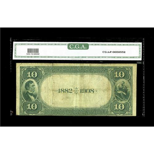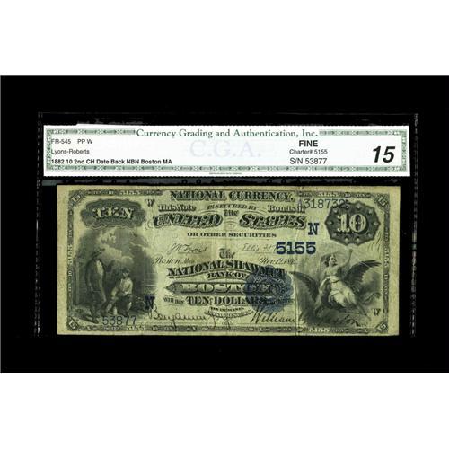 <B>Boston, MA</B></I> - $10 1882 Date Back Fr. 545 <B>The National Shawmut Bank</B></I> Ch. # 5155<BR>A Boston institution that was chartered in 1898 and confined its issue to 1882 Brown Backs, Date Backs and 1902 Plain Backs. This <B>CGA Fine 15</B></I> example offered here is reasonably margined all around.