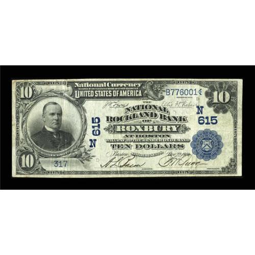 <B>Boston, MA </B></I>- $10 1902 Date Back Fr. 616<B> The National Rockland Bank of Roxbury at Boston</B></I> Ch. # (N)615<BR> This extremely scarce bank was based in the Roxbury neighborhood, changing its title to Boston in 1904. Only four notes are known bearing the first title, and just four (along with an uncut sheet of Red Seals) make up the total census population with the second title. Pen signed <B>Fine++, </B></I> a nice example from one of Beantown's most difficult to obtain issuers. <BR><BR><b>Shipping:</b> Coins & Currency (<a target="_blank" href="http://www.heritageauctions.com/common/shipping.php">view shipping information</a>)