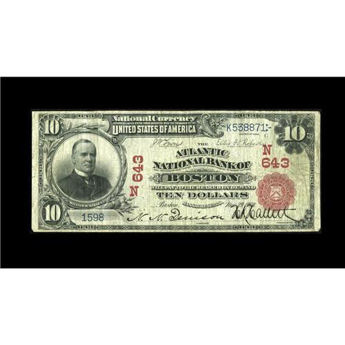 <B>Boston, MA</B></I> - $10 1902 Red Seal Fr. 613 <B>The Atlantic NB</B></I> Ch. # (N)643<BR>This note appeared for the first time in last year's September Stacks auction, and is the lowest serial number of the three Red Seals currently known on the bank. Six pinholes are noted on this pleasing <B>Fine</B></I> example.