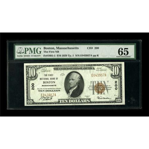 <B>Boston, MA</B></I> - $10 1929 Ty. 1 <B>The First NB</B></I> Ch. # 200<BR> An attractive and fully margined Beantown Gem. <B>PMG Gem Uncirculated 65.</B></I><BR><BR><b>Shipping:</b> Coins & Currency (<a target="_blank" href="http://www.heritageauctions.com/common/shipping.php">view shipping information</a>)