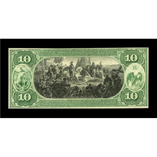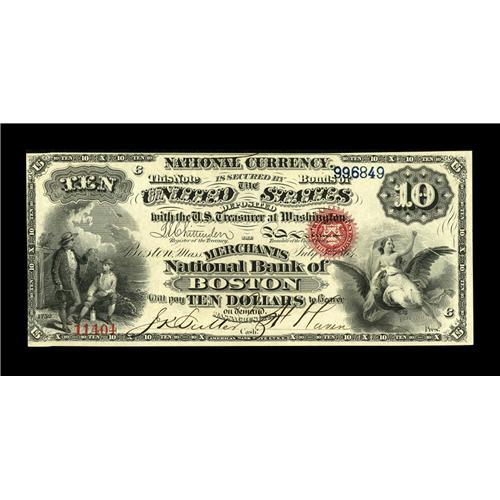 <B>Boston, MA</B></I> - $10 Original Fr. 409 <B>The Merchants NB</B></I> Ch. # 475<BR>This note, part of the Stella Family collection, was originally Lot 3506 of our January, 1997 Florida auction. We noted at that time "This is a rare type in this state of preservation, not to be confused with the far more easily available Series 1875 $10. Although pricing guides such as Friedberg and the Green Sheet reflect only minor pricing differences, our experience over a 30 year span has been that $10 Originals are outnumbered by Series 1875 tens in the uncirculated and higher grade ranges by at least a 20 to 1 ratio. This example, although impossible to grade Gem because of the trimmed in left margin (although the note is perfectly centered on the reverse), is one of the very nicest examples of this type we have ever had to offer. It is also one of the few we've seen with the early issue blue Treasury numbers as well. <B>Choice Crisp Uncirculated.</B></I> Time has borne out that 1997 observation, as the census now shows just five CU Original Series tens from all states combined, compared to well over 100 such examples in the 1875 series. If you are a serious collector, throw away the Green Sheet and other pricing guides, raise your bidder card high, and hope that every other participant loses his nerve before you do.<BR><I>From The Bill and Kathy Stella Currency Collection</B></I><BR><BR><b>Shipping:</b> Coin/Currency (<a target="_blank" href="http://www.heritageauctions.com/common/shipping.php">view shipping information</a>)
