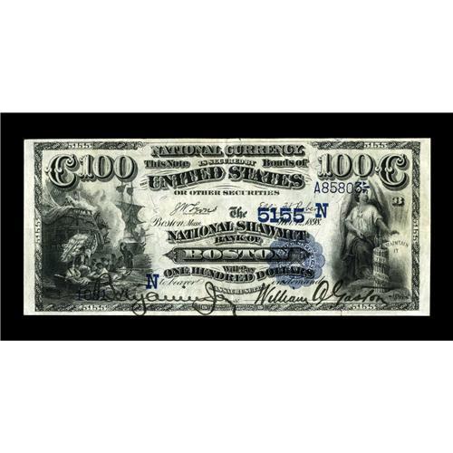 <B>Boston, MA</B></I> - $100 1882 Date Back Fr. 571 <B>The National Shawmut Bank</B></I> Ch. # (N)5155<BR>A beautifully margined example of this very scarce type. Only about 125 $100 1882 Date Backs are listed in the new Kelly census from all banks in the country combined, with just seven pieces, including this example, coming from all Massachusetts banks combined. <B>Very Fine-Extremely Fine.</B></I><BR><I>From The Bill and Kathy Stella Currency Collection</B></I><BR><BR><b>Shipping:</b> Coin/Currency (<a target="_blank" href="http://www.heritageauctions.com/common/shipping.php">view shipping information</a>)