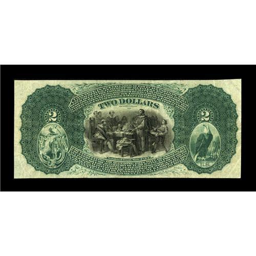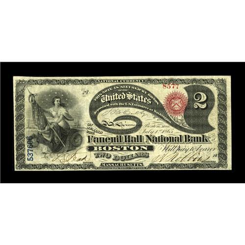 <B>Boston, MA</B></I> - $2 Original Fr. 387 <B>The Faneuil Hall NB</B></I> Ch. # 847<BR>This is a tougher Boston bank with a wonderfully evocative title. Although it issued through 1909, the only notes known from here are First Charters, with this piece one of only four Original Series Deuces recorded in the census, and by far the nicest. It is indeed a perfect type note, with far better margins than most of its brethren, bright colors, strong clear signatures, and the blue Treasury numbers which indicate its early printing status. <B>Very Fine,</B></I> a premium specimen.<BR><I>From The Bill and Kathy Stella Currency Collection</B></I><BR><BR><b>Shipping:</b> Coin/Currency (<a target="_blank" href="http://www.heritageauctions.com/common/shipping.php">view shipping information</a>)