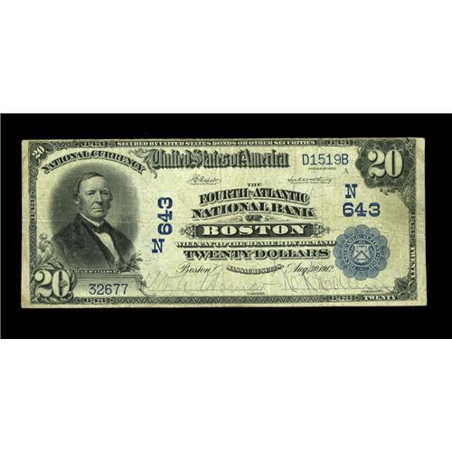 <B>Boston, MA</B></I> - $20 1902 Date Back Fr. 646 <B>The Fourth-Atlantic NB</B></I> Ch. # (N)643<BR>A <B>Fine</B></I> $20 Date Back bearing the second of four titles under which this bank issued large size notes. The published census with this name stands at 10 examples, demonstrating the acquisition challenges of collecting even prolific issuers from large cities.