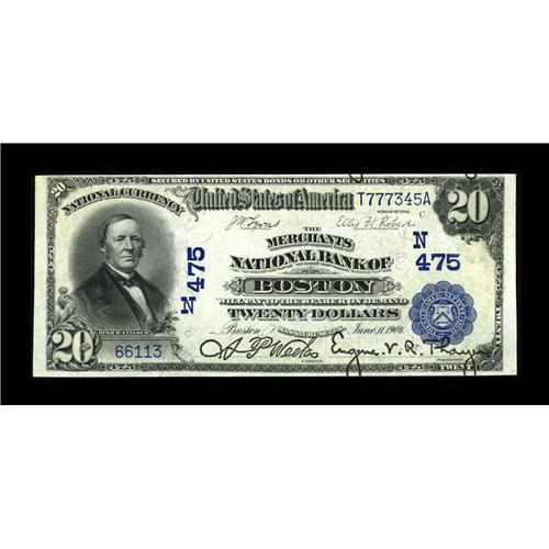 <B>Boston, MA</B></I> - $20 1902 Date Back Fr. 642 <B>The Merchants NB</B></I> Ch. # (N)475<BR>A bright and nicely centered <B>About Uncirculated</B></I> example from a prolific issuer chartered in 1864 and surviving through the end of the National Bank Note era. A.P. Weeks signs as Cashier and Eugene V.R. Thayer as President. Although 36 large notes are now documented in the census from here, tonight's offering is the sole representative of the $20 Date Back design type.<BR><I>From The Bill and Kathy Stella Currency Collection</B></I><BR><BR><b>Shipping:</b> Coin/Currency (<a target="_blank" href="http://www.heritageauctions.com/common/shipping.php">view shipping information</a>)